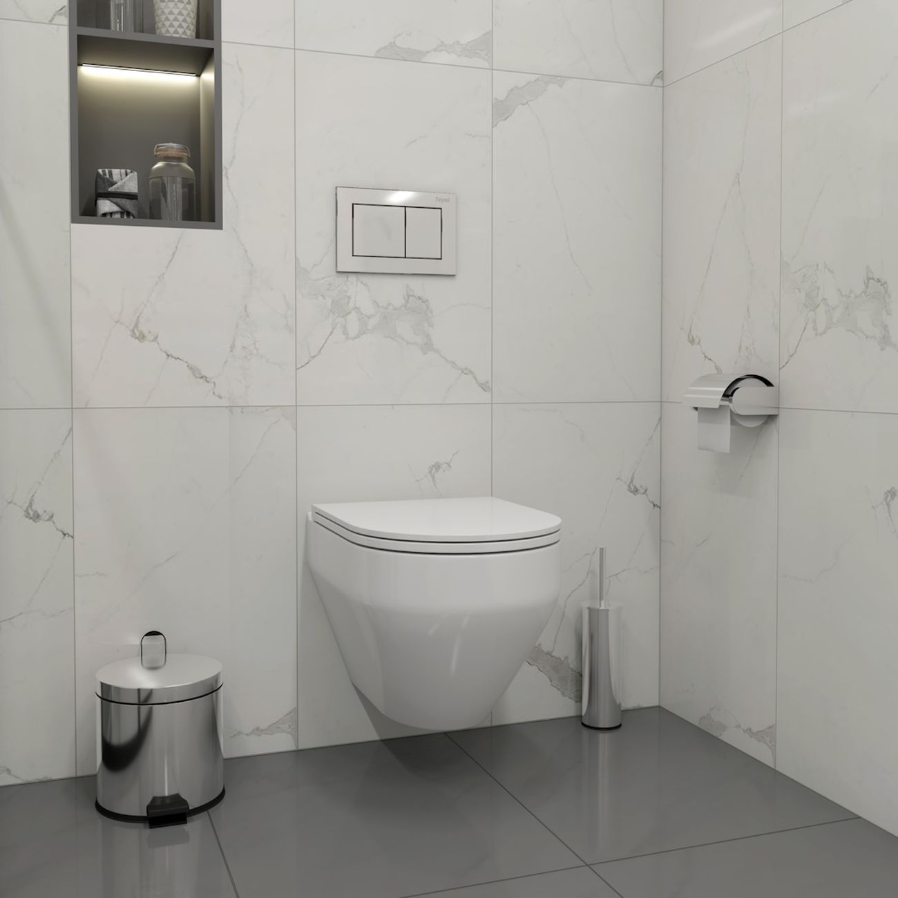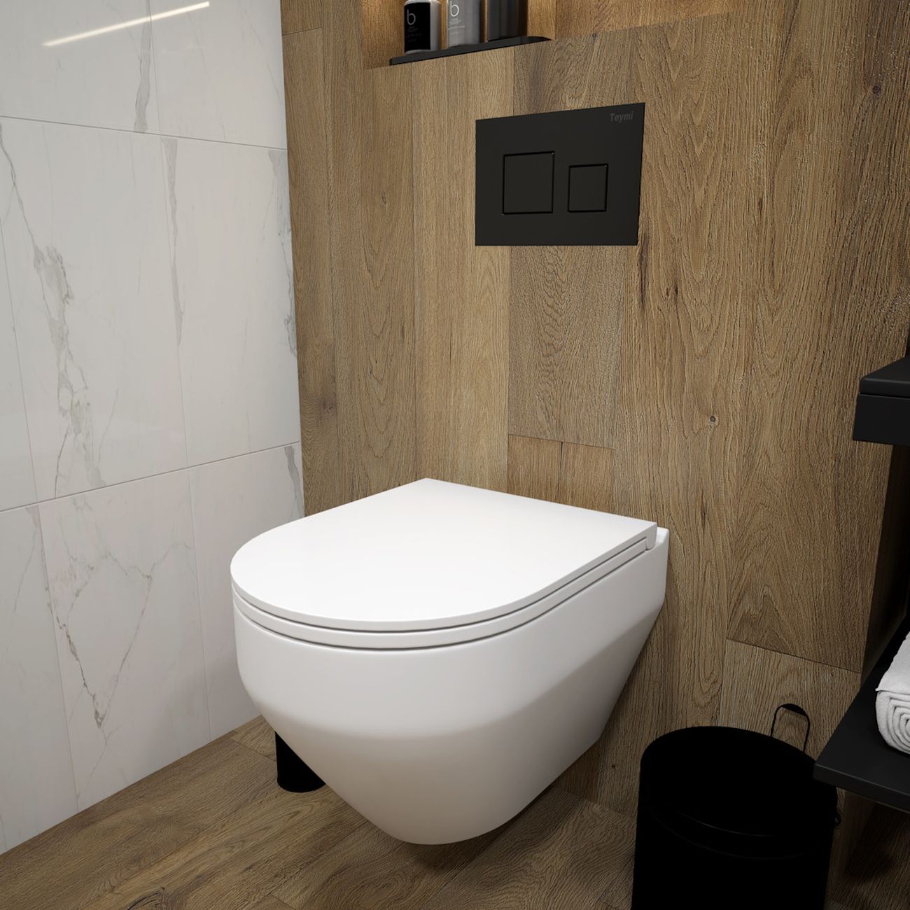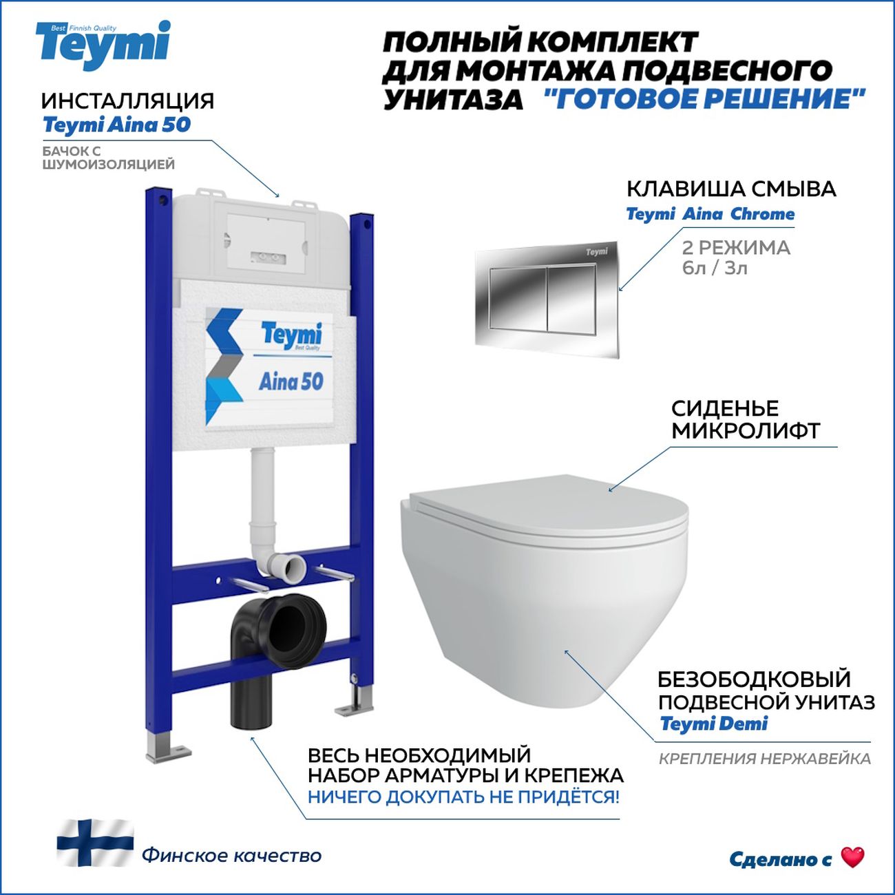 Комплект «Готовое решение» для установки инсталляции с подвесным унитазом: -- инсталляция TEYMI AINA 50 T70033 – монтажная рама из цельного стального профиля прямоугольного сечения, позволяющая выдерживать нагрузки до 400 кг. Габаритная ширина рамы 525 мм; -- клавиша смыва TEYMI AINA T70012CH, цвет ХРОМ ГЛЯНЕЦ; -- унитаз подвесной безободковый TEYMI DEMI T40208; -- сиденье с микролифтом; -- полный комплект арматуры для монтажа: уплотнительные кольца, манжеты, труба смыва, фановый отвод с удлинителем, защитный кожух ревизионного окна с крепежной рамкой, закрывающей панелью и крышкой; -- полный комплект крепежа для установки: крепеж к стене, шпильки для унитаза, крепежная рамка, соединительные шпильки, толкатели, фиксаторы; -- инструкция по установке и обслуживанию. Преимущества комплекта: -- полная (максимальная) комплектация для установки - больше ничего докупать не придётся; -- все составляющие комплекта идеально подходят друг к другу; -- рама покрыта суперпрочной порошковой краской синего цвета с антикоррозионными свойствами; -- высота монтажной рамы может регулироваться с ходом до 20 см с помощью ножек из оцинкованной стали; -- универсальный монтаж – межосевое расстояние под шпильки для подвесного унитаза 180 и 230 мм – подходит ко всем подвесным унитазам; -- сливной бачок скрытого монтажа, изготовленный из полиэтилена низкого давления, рассчитан на 200 тысяч циклов смыва, а цельнолитая бесшовная конструкция позволит работать без протечек в течение всего периода эксплуатации; -- 2-режимный слив 3 / 6 л с возможностью регулировки; -- лёгкость обслуживания бачка благодаря ревизионному окну, скрытому за клавишей смыва; -- гарантия 10 лет на весь комплект и 50 лет на стальную раму. Размер инсталляции с бачком: высота 1055 мм Х ширина 525 мм Х глубина 96 мм. Уважаемые покупатели, обращаем ваше внимание на то, что система инсталляции TEYMI AINA 50 может быть также укомплектована другими клавишами смыва или подвесными унитазами от бренда TEYMI (вы можете найти их на этом сайте по указанным артикулам). Предлагаем вам рассмотреть варианты сочетания со следующими клавишами: : HELMI хром T70202CH : HELMI черная T70203BM : HELMI белая T70018WM : LINA хром T70102CH : LINA черная T70103BM : LINA белая T70019WM : AINA хром T70012CH : AINA черная T70013BM : AINA белая T70020WM : KATI хром T70701CH : KATI черная T70702BM : KATI белая T70021WM : ELLIE хром T70022CH : ELLIE черная T70023BM : ELLIE белая T70024WM Также просим обратить взгляд на наши лучшие безободковые подвесные унитазы: : SOLLI T40201 : LINA S T40102 : HELMI S T40302 : HELMI VORTEX T40303 : IVA T40601 : ELLIE T40802 : LINA MEDIA T40105 : KATI T40701 : HANNA PRO T40901 : HELMI S BLACK T40302MB : VITRA PRO T40806 : VITRA T40804 : DEMI T40208 : LINA VORTEX T40110 : RITTA T40809 : LINA PRO T40106 : LINA S BLACK T40111