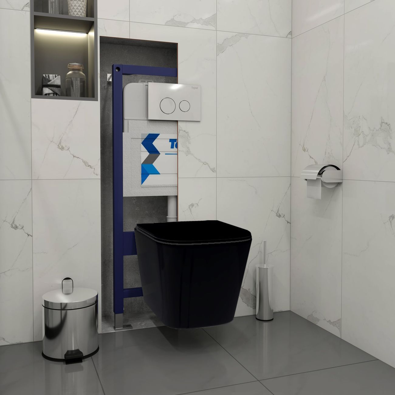 Комплект «Готовое решение» для установки инсталляции с подвесным унитазом: -- инсталляция TEYMI AINA 50 T70033 – монтажная рама из цельного стального профиля прямоугольного сечения, позволяющая выдерживать нагрузки до 400 кг. Габаритная ширина рамы 525 мм; -- клавиша смыва TEYMI LINA T70102CH, цвет ХРОМ ГЛЯНЕЦ; -- унитаз подвесной безободковый TEYMI HELMI S ЧЕРНЫЙ T40302MB; -- сиденье с микролифтом; -- полный комплект арматуры для монтажа: уплотнительные кольца, манжеты, труба смыва, фановый отвод с удлинителем, защитный кожух ревизионного окна с крепежной рамкой, закрывающей панелью и крышкой; -- полный комплект крепежа для установки: крепеж к стене, шпильки для унитаза, крепежная рамка, соединительные шпильки, толкатели, фиксаторы; -- инструкция по установке и обслуживанию. Преимущества комплекта: -- полная (максимальная) комплектация для установки - больше ничего докупать не придётся; -- все составляющие комплекта идеально подходят друг к другу; -- рама покрыта суперпрочной порошковой краской синего цвета с антикоррозионными свойствами; -- высота монтажной рамы может регулироваться с ходом до 20 см с помощью ножек из оцинкованной стали; -- универсальный монтаж – межосевое расстояние под шпильки для подвесного унитаза 180 и 230 мм – подходит ко всем подвесным унитазам; -- сливной бачок скрытого монтажа, изготовленный из полиэтилена низкого давления, рассчитан на 200 тысяч циклов смыва, а цельнолитая бесшовная конструкция позволит работать без протечек в течение всего периода эксплуатации; -- 2-режимный слив 3 / 6 л с возможностью регулировки; -- лёгкость обслуживания бачка благодаря ревизионному окну, скрытому за клавишей смыва; -- гарантия 10 лет на весь комплект и 50 лет на стальную раму. Размер инсталляции с бачком: высота 1055 мм Х ширина 525 мм Х глубина 96 мм. Уважаемые покупатели, обращаем ваше внимание на то, что система инсталляции TEYMI AINA 50 может быть также укомплектована другими клавишами смыва или подвесными унитазами от бренда TEYMI (вы можете найти их на этом сайте по указанным артикулам). Предлагаем вам рассмотреть варианты сочетания со следующими клавишами: : HELMI хром T70202CH : HELMI черная T70203BM : HELMI белая T70018WM : LINA хром T70102CH : LINA черная T70103BM : LINA белая T70019WM : AINA хром T70012CH : AINA черная T70013BM : AINA белая T70020WM : KATI хром T70701CH : KATI черная T70702BM : KATI белая T70021WM : ELLIE хром T70022CH : ELLIE черная T70023BM : ELLIE белая T70024WM Также просим обратить взгляд на наши лучшие безободковые подвесные унитазы: : SOLLI T40201 : LINA S T40102 : HELMI S T40302 : HELMI VORTEX T40303 : IVA T40601 : ELLIE T40802 : LINA MEDIA T40105 : KATI T40701 : HANNA PRO T40901 : HELMI S BLACK T40302MB : VITRA PRO T40806 : VITRA T40804 : DEMI T40208 : LINA VORTEX T40110 : RITTA T40809 : LINA PRO T40106 : LINA S BLACK T40111