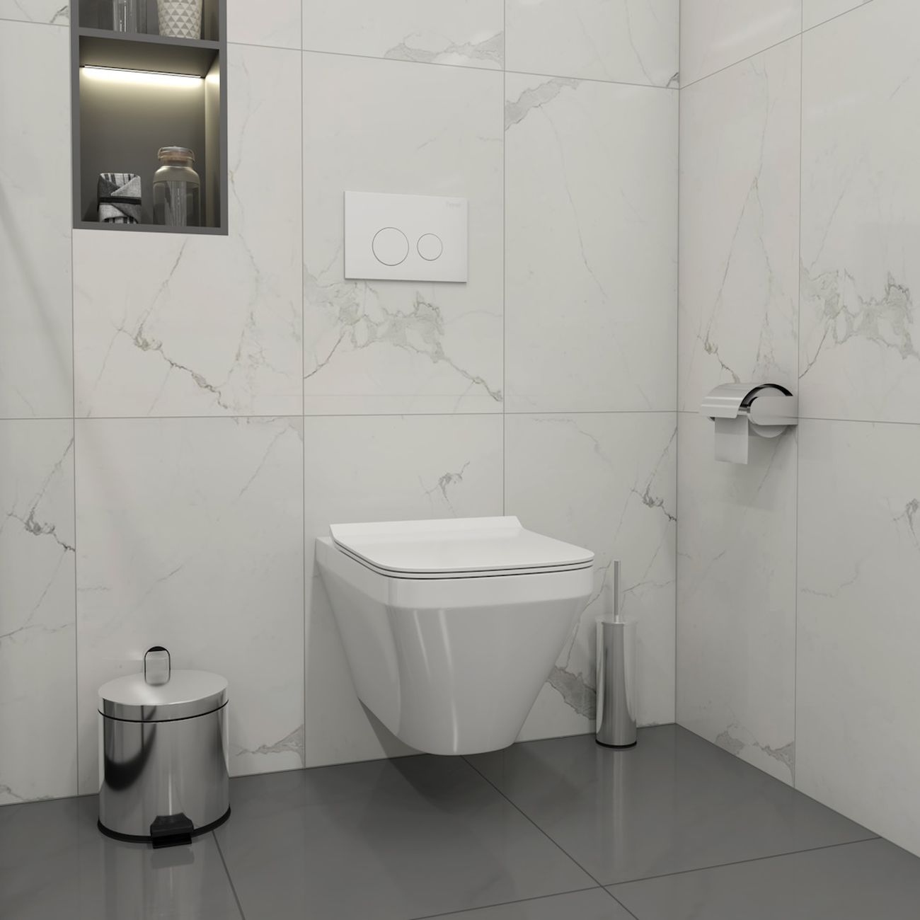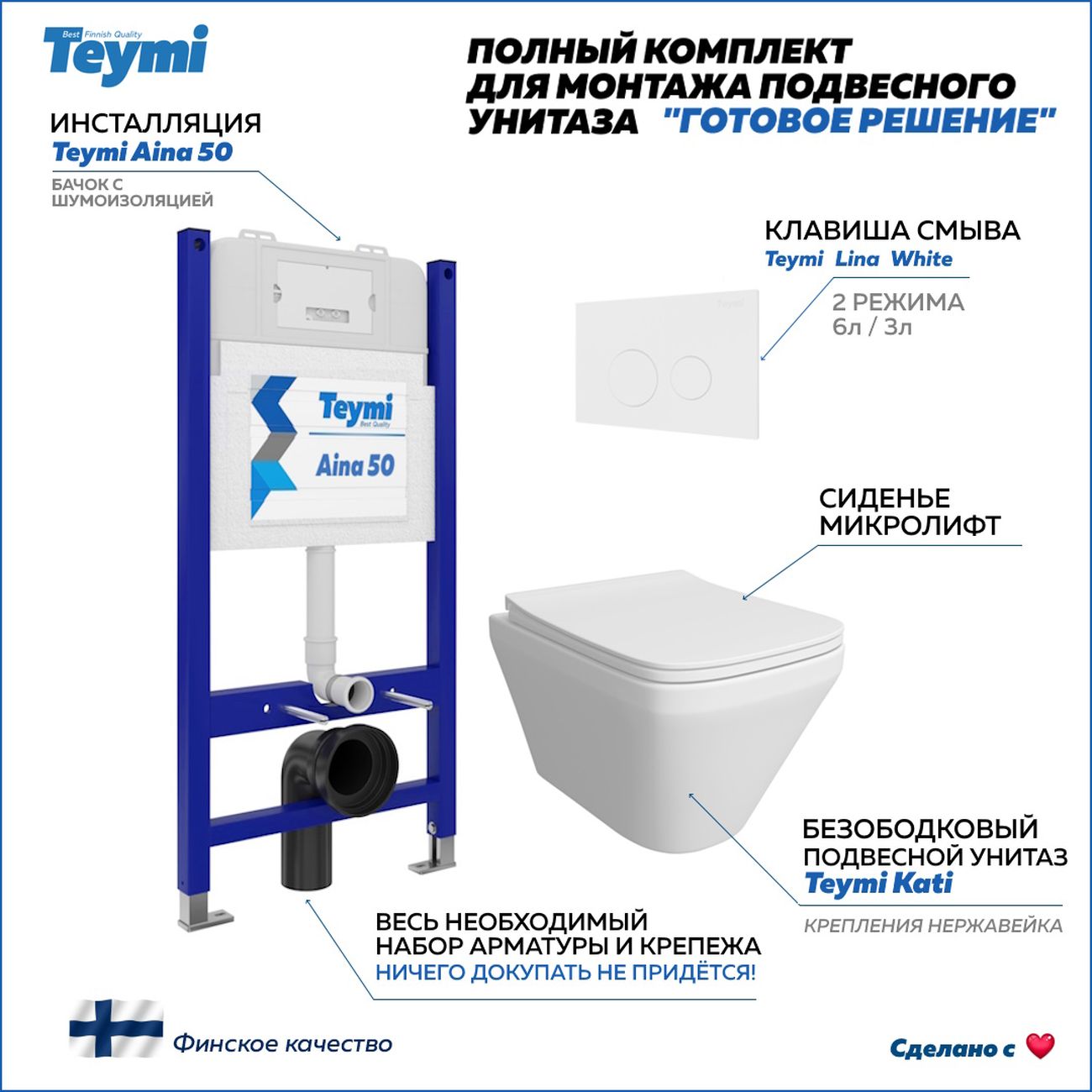 Комплект «Готовое решение» для установки инсталляции с подвесным унитазом: -- инсталляция TEYMI AINA 50 T70033 – монтажная рама из цельного стального профиля прямоугольного сечения, позволяющая выдерживать нагрузки до 400 кг. Габаритная ширина рамы 525 мм; -- клавиша смыва TEYMI LINA T70019WM, цвет БЕЛЫЙ МАТОВЫЙ; -- унитаз подвесной безободковый TEYMI KATI T40701; -- ультратонкое сиденье с микролифтом; -- полный комплект арматуры для монтажа: уплотнительные кольца, манжеты, труба смыва, фановый отвод с удлинителем, защитный кожух ревизионного окна с крепежной рамкой, закрывающей панелью и крышкой; -- полный комплект крепежа для установки: крепеж к стене, шпильки для унитаза, крепежная рамка, соединительные шпильки, толкатели, фиксаторы; -- инструкция по установке и обслуживанию. Преимущества комплекта: -- полная (максимальная) комплектация для установки - больше ничего докупать не придётся; -- все составляющие комплекта идеально подходят друг к другу; -- рама покрыта суперпрочной порошковой краской синего цвета с антикоррозионными свойствами; -- высота монтажной рамы может регулироваться с ходом до 20 см с помощью ножек из оцинкованной стали; -- универсальный монтаж – межосевое расстояние под шпильки для подвесного унитаза 180 и 230 мм – подходит ко всем подвесным унитазам; -- сливной бачок скрытого монтажа, изготовленный из полиэтилена низкого давления, рассчитан на 200 тысяч циклов смыва, а цельнолитая бесшовная конструкция позволит работать без протечек в течение всего периода эксплуатации; -- 2-режимный слив 3 / 6 л с возможностью регулировки; -- лёгкость обслуживания бачка благодаря ревизионному окну, скрытому за клавишей смыва; -- гарантия 10 лет на весь комплект и 50 лет на стальную раму. Размер инсталляции с бачком: высота 1055 мм Х ширина 525 мм Х глубина 96 мм. Уважаемые покупатели, обращаем ваше внимание на то, что система инсталляции TEYMI AINA 50 может быть также укомплектована другими клавишами смыва или подвесными унитазами от бренда TEYMI (вы можете найти их на этом сайте по указанным артикулам). Предлагаем вам рассмотреть варианты сочетания со следующими клавишами: : HELMI хром T70202CH : HELMI черная T70203BM : HELMI белая T70018WM : LINA хром T70102CH : LINA черная T70103BM : LINA белая T70019WM : AINA хром T70012CH : AINA черная T70013BM : AINA белая T70020WM : KATI хром T70701CH : KATI черная T70702BM : KATI белая T70021WM : ELLIE хром T70022CH : ELLIE черная T70023BM : ELLIE белая T70024WM Также просим обратить взгляд на наши лучшие безободковые подвесные унитазы: : SOLLI T40201 : LINA S T40102 : HELMI S T40302 : HELMI VORTEX T40303 : IVA T40601 : ELLIE T40802 : LINA MEDIA T40105 : KATI T40701 : HANNA PRO T40901 : HELMI S BLACK T40302MB : VITRA PRO T40806 : VITRA T40804 : DEMI T40208 : LINA VORTEX T40110 : RITTA T40809 : LINA PRO T40106 : LINA S BLACK T40111