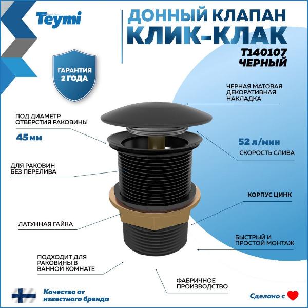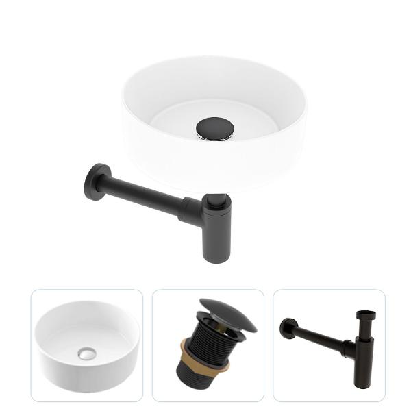 В комплект 3 в 1 входит: 1. Раковина накладная Teymi Lina D41, белая; 2. Донный клапан Teymi для раковины без перелива, черный; 3. Сифон Teymi для раковины, черный матовый. Характеристики раковины: -- Артикул производителя: T50105; -- Серия / коллекция: Lina; -- Модель: Lina D41; -- Тип раковины: накладная; -- Установка: на столешницу / на тумбу; -- Возможность встройки: нет; -- Материал изготовления: санфарфор; -- Цвет: белый глянцевый; -- Ширина: 410 мм; -- Глубина: 410 мм; -- Высота от столешницы: 140 мм; -- Количество чаш: одна; -- Мыльница: нет; -- Полотенцедержатель: нет; -- Расположение крыла: без крыла; -- Форма: круглая; -- Полочка под смеситель: нет; -- Отверстие под смеситель: нет; -- Отверстие под слив: одно; -- Отверстие под перелив: нет; -- Диаметр сливного отверстия: 45 мм; -- Слив-перелив: в поставку не входит; -- Смеситель: в поставку не входит; -- Гарантийный срок: 10 лет; -- Страна изготовления: Китай; -- Страна бренда: Финляндия; -- Бренд: Teymi. Характеристики выпуска: -- Артикул производителя: T140107; -- Тип изделия: донный клапан для раковины; -- Область применения: ванная комната; -- Материал корпуса: цинк; -- Цвет крышки: черный; -- Покрытие крышки: глянцевое; -- Материал крышки: керамика; -- Материал гайки: латунь; -- Функция клик-клак: да; -- Скорость слива воды: 52 л/мин; -- Диаметр отверстия раковины: 45 мм; -- Гарантия: 2 года; -- Страна производства: Китай; -- Страна бренда: Финляндия; -- Бренд: Teymi. Характеристики сифона: -- Артикул производителя: T140101; -- Тип изделия: сифон для раковины; -- Область применения: ванная комната; -- Материал изготовления: цинк; -- Цвет: черный; -- Покрытие: матовое; -- Скорость слива воды: 52 л/мин; -- Диаметр отвода: 32 мм; -- Диаметр отверстия раковины: 45–52 мм; -- Гарантия: 2 года; -- Страна производства: Китай; -- Страна бренда: Финляндия; -- Бренд: Teymi. Внимание! Смеситель в комплект поставки не входит, его надо приобретать отдельно.