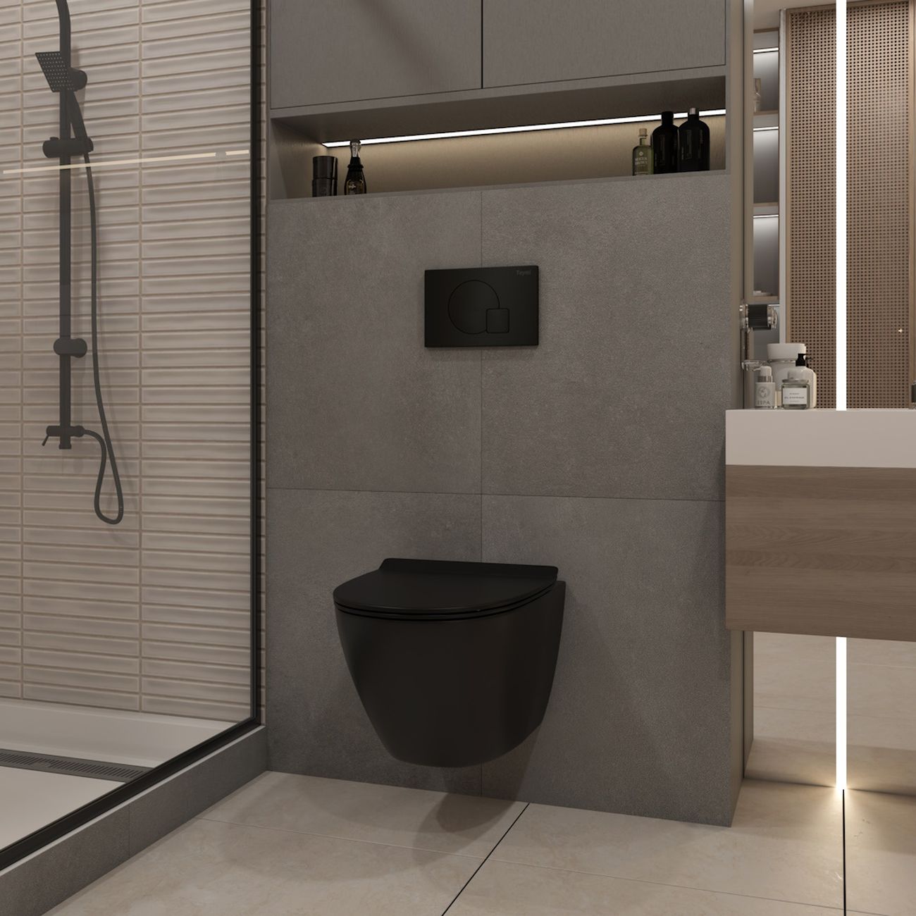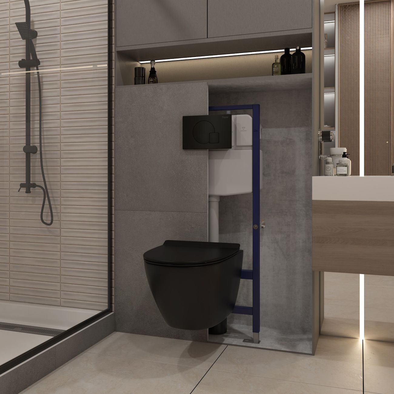Комплект «Готовое решение» для установки инсталляции с подвесным унитазом: -- инсталляция TEYMI AINA 55 T70035 – монтажная рама из цельного стального профиля прямоугольного сечения, позволяющая выдерживать нагрузки до 400 кг. Габаритная ширина рамы 470 мм; -- клавиша смыва TEYMI ELLIE T70023BM, цвет ЧЕРНЫЙ МАТОВЫЙ; -- унитаз подвесной безободковый TEYMI LINA PRO VORTEX BLACK T40114; -- сиденье с микролифтом; -- полный комплект арматуры для монтажа: уплотнительные кольца, манжеты, труба смыва, фановый отвод с удлинителем, защитный кожух ревизионного окна с крепежной рамкой, закрывающей панелью и крышкой; -- полный комплект крепежа для установки: крепеж к стене, шпильки для унитаза, крепежная рамка, соединительные шпильки, толкатели, фиксаторы; -- инструкция по установке и обслуживанию. Преимущества комплекта: -- полная (максимальная) комплектация для установки - больше ничего докупать не придётся; -- все составляющие комплекта идеально подходят друг к другу; -- рама покрыта суперпрочной порошковой краской синего цвета с антикоррозионными свойствами; -- высота монтажной рамы может регулироваться с помощью ножек из оцинкованной стали; -- универсальный монтаж – межосевое расстояние под шпильки для подвесного унитаза 180 и 230 мм – подходит ко всем подвесным унитазам; -- сливной бачок скрытого монтажа, изготовленный из полиэтилена низкого давления, рассчитан на 200 тысяч циклов смыва, а цельнолитая бесшовная конструкция позволит работать без протечек в течение всего периода эксплуатации; -- 2-режимный слив 3 / 6 л с возможностью регулировки; -- лёгкость обслуживания бачка благодаря ревизионному окну, скрытому за клавишей смыва; -- гарантия 10 лет на весь комплект и 50 лет на стальную раму. Размер изделия: высота 1130 мм (регулируется) Х ширина 470 мм Х глубина 102 мм. Уважаемые покупатели, обращаем ваше внимание на то, что система инсталляции TEYMI AINA 55 может быть также укомплектована другими клавишами смыва или подвесными унитазами от бренда TEYMI (вы можете найти их на этом сайте по указанным артикулам). Предлагаем вам рассмотреть варианты сочетания со следующими клавишами: : HELMI хром T70202CH : HELMI черная T70203BM : HELMI белая T70018WM : HELMI нержавеющая сталь T70204 : HELMI черный матовый T70205 : HELMI белый глянцевый T70206 : LINA хром T70102CH : LINA черная T70103BM : LINA белая T70019WM : LINA нержавеющая сталь T70104 : LINA черный матовый T70105 : LINA белый матовый T70106 : AINA хром T70012CH : AINA черная T70013BM : AINA белая T70020WM : AINA нержавеющая сталь T70014 : KATI хром T70701CH : KATI черная T70702BM : KATI белая T70021WM : ELLIE хром T70022CH : ELLIE черная T70023BM : ELLIE белая T70024WM Также просим обратить взгляд на наши лучшие безободковые подвесные унитазы: : SOLLI T40201 : LINA S T40102 : HELMI S T40302 : HELMI VORTEX T40303 : IVA T40601 : ELLIE T40802 : LINA MEDIA T40105 : KATI T40701 : HANNA PRO T40901 : HELMI S BLACK T40302MB : VITRA PRO T40806 : VITRA T40804 : DEMI T40208 : LINA VORTEX T40110 : RITTA T40809 : LINA PRO T40106 : LINA S BLACK T40111