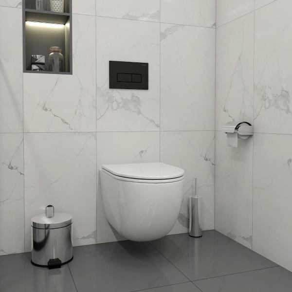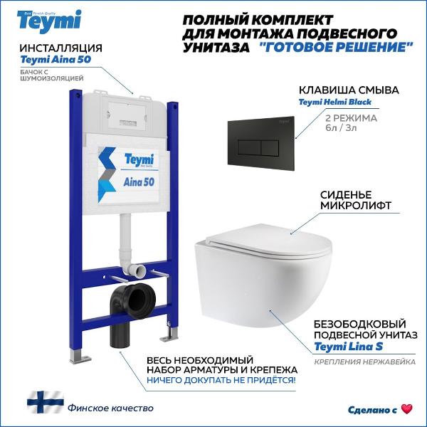 Комплект «Готовое решение» для установки инсталляции с подвесным унитазом: -- инсталляция TEYMI AINA 50 T70033 – монтажная рама из цельного стального профиля прямоугольного сечения, позволяющая выдерживать нагрузки до 400 кг. Габаритная ширина рамы 525 мм; -- клавиша смыва TEYMI HELMI T70203BM, цвет ЧЕРНЫЙ МАТОВЫЙ; -- унитаз подвесной безободковый TEYMI LINA S T40102; -- ультратонкое сиденье с микролифтом; -- полный комплект арматуры для монтажа: уплотнительные кольца, манжеты, труба смыва, фановый отвод с удлинителем, защитный кожух ревизионного окна с крепежной рамкой, закрывающей панелью и крышкой; -- полный комплект крепежа для установки: крепеж к стене, шпильки для унитаза, крепежная рамка, соединительные шпильки, толкатели, фиксаторы; -- инструкция по установке и обслуживанию. Преимущества комплекта: -- полная (максимальная) комплектация для установки - больше ничего докупать не придётся; -- все составляющие комплекта идеально подходят друг к другу; -- рама покрыта суперпрочной порошковой краской синего цвета с антикоррозионными свойствами; -- высота монтажной рамы может регулироваться с ходом до 20 см с помощью ножек из оцинкованной стали; -- универсальный монтаж – межосевое расстояние под шпильки для подвесного унитаза 180 и 230 мм – подходит ко всем подвесным унитазам; -- сливной бачок скрытого монтажа, изготовленный из полиэтилена низкого давления, рассчитан на 200 тысяч циклов смыва, а цельнолитая бесшовная конструкция позволит работать без протечек в течение всего периода эксплуатации; -- 2-режимный слив 3 / 6 л с возможностью регулировки; -- лёгкость обслуживания бачка благодаря ревизионному окну, скрытому за клавишей смыва; -- гарантия 10 лет на весь комплект и 50 лет на стальную раму. Размер инсталляции с бачком: высота 1055 мм Х ширина 525 мм Х глубина 96 мм. Уважаемые покупатели, обращаем ваше внимание на то, что система инсталляции TEYMI AINA 50 может быть также укомплектована другими клавишами смыва или подвесными унитазами от бренда TEYMI (вы можете найти их на этом сайте по указанным артикулам). Предлагаем вам рассмотреть варианты сочетания со следующими клавишами: : HELMI хром T70202CH : HELMI черная T70203BM : HELMI белая T70018WM : LINA хром T70102CH : LINA черная T70103BM : LINA белая T70019WM : AINA хром T70012CH : AINA черная T70013BM : AINA белая T70020WM : KATI хром T70701CH : KATI черная T70702BM : KATI белая T70021WM : ELLIE хром T70022CH : ELLIE черная T70023BM : ELLIE белая T70024WM Также просим обратить взгляд на наши лучшие безободковые подвесные унитазы: : SOLLI T40201 : LINA S T40102 : HELMI S T40302 : HELMI VORTEX T40303 : IVA T40601 : ELLIE T40802 : LINA MEDIA T40105 : KATI T40701 : HANNA PRO T40901 : HELMI S BLACK T40302MB : VITRA PRO T40806 : VITRA T40804 : DEMI T40208 : LINA VORTEX T40110 : RITTA T40809 : LINA PRO T40106 : LINA S BLACK T40111