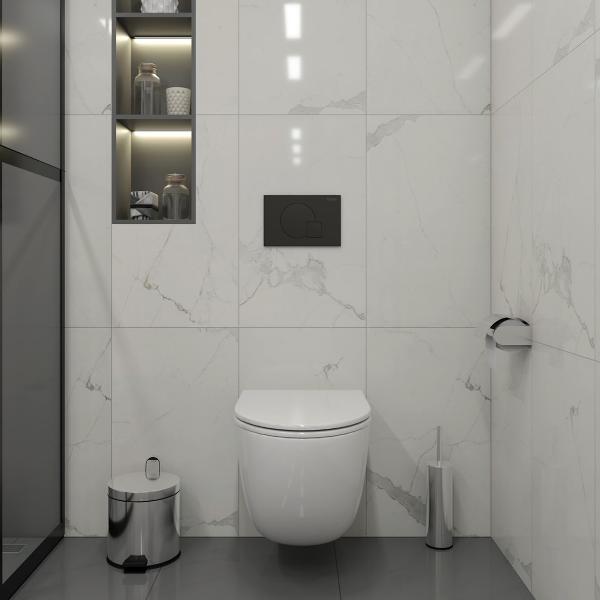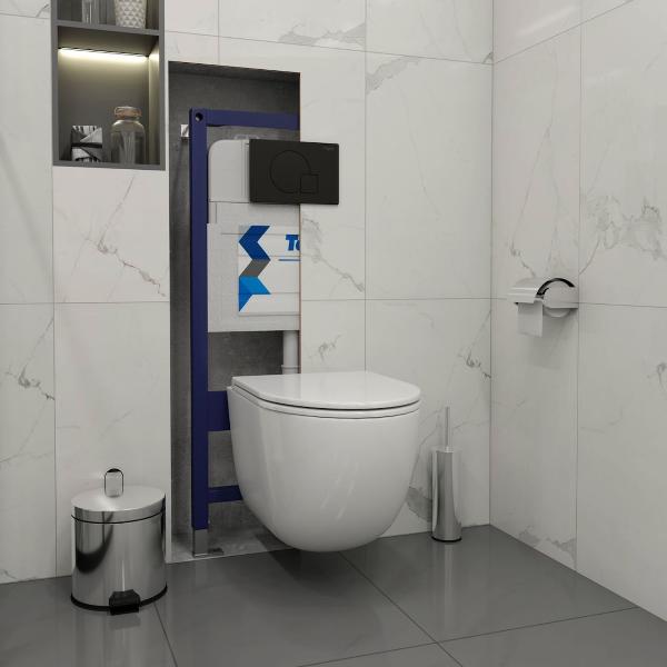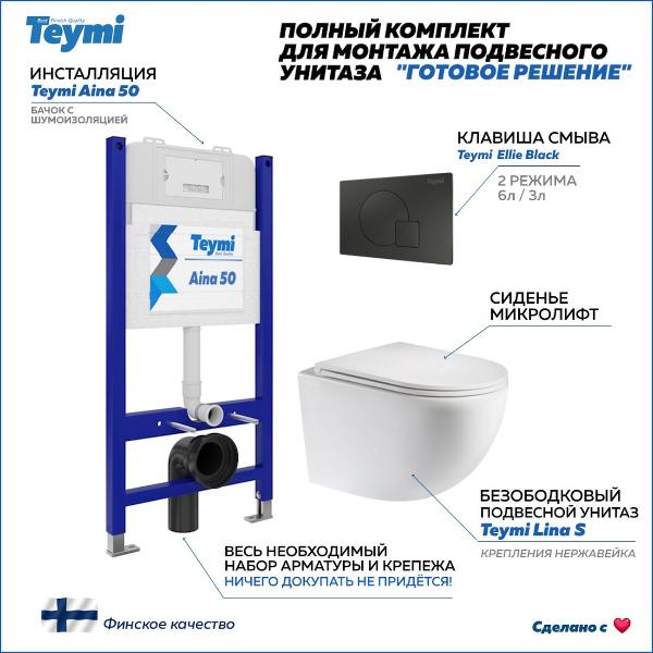 Комплект «Готовое решение» для установки инсталляции с подвесным унитазом: -- инсталляция TEYMI AINA 50 T70033 – монтажная рама из цельного стального профиля прямоугольного сечения, позволяющая выдерживать нагрузки до 400 кг. Габаритная ширина рамы 525 мм; -- клавиша смыва TEYMI ELLIE T70023BM, цвет ЧЕРНЫЙ МАТОВЫЙ; -- унитаз подвесной безободковый TEYMI LINA S T40102; -- ультратонкое сиденье с микролифтом; -- полный комплект арматуры для монтажа: уплотнительные кольца, манжеты, труба смыва, фановый отвод с удлинителем, защитный кожух ревизионного окна с крепежной рамкой, закрывающей панелью и крышкой; -- полный комплект крепежа для установки: крепеж к стене, шпильки для унитаза, крепежная рамка, соединительные шпильки, толкатели, фиксаторы; -- инструкция по установке и обслуживанию. Преимущества комплекта: -- полная (максимальная) комплектация для установки - больше ничего докупать не придётся; -- все составляющие комплекта идеально подходят друг к другу; -- рама покрыта суперпрочной порошковой краской синего цвета с антикоррозионными свойствами; -- высота монтажной рамы может регулироваться с ходом до 20 см с помощью ножек из оцинкованной стали; -- универсальный монтаж – межосевое расстояние под шпильки для подвесного унитаза 180 и 230 мм – подходит ко всем подвесным унитазам; -- сливной бачок скрытого монтажа, изготовленный из полиэтилена низкого давления, рассчитан на 200 тысяч циклов смыва, а цельнолитая бесшовная конструкция позволит работать без протечек в течение всего периода эксплуатации; -- 2-режимный слив 3 / 6 л с возможностью регулировки; -- лёгкость обслуживания бачка благодаря ревизионному окну, скрытому за клавишей смыва; -- гарантия 10 лет на весь комплект и 50 лет на стальную раму. Размер инсталляции с бачком: высота 1055 мм Х ширина 525 мм Х глубина 96 мм. Уважаемые покупатели, обращаем ваше внимание на то, что система инсталляции TEYMI AINA 50 может быть также укомплектована другими клавишами смыва или подвесными унитазами от бренда TEYMI (вы можете найти их на этом сайте по указанным артикулам). Предлагаем вам рассмотреть варианты сочетания со следующими клавишами: : HELMI хром T70202CH : HELMI черная T70203BM : HELMI белая T70018WM : LINA хром T70102CH : LINA черная T70103BM : LINA белая T70019WM : AINA хром T70012CH : AINA черная T70013BM : AINA белая T70020WM : KATI хром T70701CH : KATI черная T70702BM : KATI белая T70021WM : ELLIE хром T70022CH : ELLIE черная T70023BM : ELLIE белая T70024WM Также просим обратить взгляд на наши лучшие безободковые подвесные унитазы: : SOLLI T40201 : LINA S T40102 : HELMI S T40302 : HELMI VORTEX T40303 : IVA T40601 : ELLIE T40802 : LINA MEDIA T40105 : KATI T40701 : HANNA PRO T40901 : HELMI S BLACK T40302MB : VITRA PRO T40806 : VITRA T40804 : DEMI T40208 : LINA VORTEX T40110 : RITTA T40809 : LINA PRO T40106 : LINA S BLACK T40111