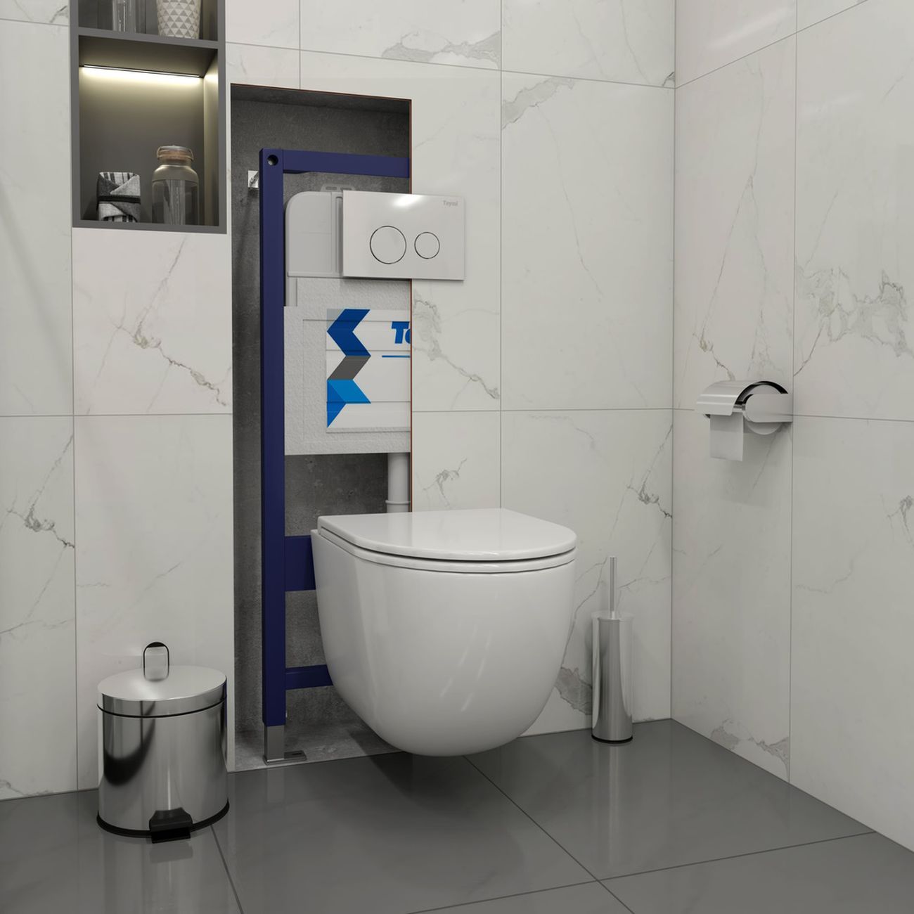Комплект «Готовое решение» для установки инсталляции с подвесным унитазом: -- инсталляция TEYMI AINA 50 T70033 – монтажная рама из цельного стального профиля прямоугольного сечения, позволяющая выдерживать нагрузки до 400 кг. Габаритная ширина рамы 525 мм; -- клавиша смыва TEYMI LINA T70102CH, цвет ХРОМ ГЛЯНЕЦ; -- унитаз подвесной безободковый TEYMI LINA VORTEX T40110; -- ультратонкое сиденье с микролифтом; -- полный комплект арматуры для монтажа: уплотнительные кольца, манжеты, труба смыва, фановый отвод с удлинителем, защитный кожух ревизионного окна с крепежной рамкой, закрывающей панелью и крышкой; -- полный комплект крепежа для установки: крепеж к стене, шпильки для унитаза, крепежная рамка, соединительные шпильки, толкатели, фиксаторы; -- инструкция по установке и обслуживанию. Преимущества комплекта: -- полная (максимальная) комплектация для установки - больше ничего докупать не придётся; -- все составляющие комплекта идеально подходят друг к другу; -- рама покрыта суперпрочной порошковой краской синего цвета с антикоррозионными свойствами; -- высота монтажной рамы может регулироваться с ходом до 20 см с помощью ножек из оцинкованной стали; -- универсальный монтаж – межосевое расстояние под шпильки для подвесного унитаза 180 и 230 мм – подходит ко всем подвесным унитазам; -- сливной бачок скрытого монтажа, изготовленный из полиэтилена низкого давления, рассчитан на 200 тысяч циклов смыва, а цельнолитая бесшовная конструкция позволит работать без протечек в течение всего периода эксплуатации; -- 2-режимный слив 3 / 6 л с возможностью регулировки; -- лёгкость обслуживания бачка благодаря ревизионному окну, скрытому за клавишей смыва; -- гарантия 10 лет на весь комплект и 50 лет на стальную раму. Размер инсталляции с бачком: высота 1055 мм Х ширина 525 мм Х глубина 96 мм. Уважаемые покупатели, обращаем ваше внимание на то, что система инсталляции TEYMI AINA 50 может быть также укомплектована другими клавишами смыва или подвесными унитазами от бренда TEYMI (вы можете найти их на этом сайте по указанным артикулам). Предлагаем вам рассмотреть варианты сочетания со следующими клавишами: : HELMI хром T70202CH : HELMI черная T70203BM : HELMI белая T70018WM : LINA хром T70102CH : LINA черная T70103BM : LINA белая T70019WM : AINA хром T70012CH : AINA черная T70013BM : AINA белая T70020WM : KATI хром T70701CH : KATI черная T70702BM : KATI белая T70021WM : ELLIE хром T70022CH : ELLIE черная T70023BM : ELLIE белая T70024WM Также просим обратить взгляд на наши лучшие безободковые подвесные унитазы: : SOLLI T40201 : LINA S T40102 : HELMI S T40302 : HELMI VORTEX T40303 : IVA T40601 : ELLIE T40802 : LINA MEDIA T40105 : KATI T40701 : HANNA PRO T40901 : HELMI S BLACK T40302MB : VITRA PRO T40806 : VITRA T40804 : DEMI T40208 : LINA VORTEX T40110 : RITTA T40809 : LINA PRO T40106 : LINA S BLACK T40111