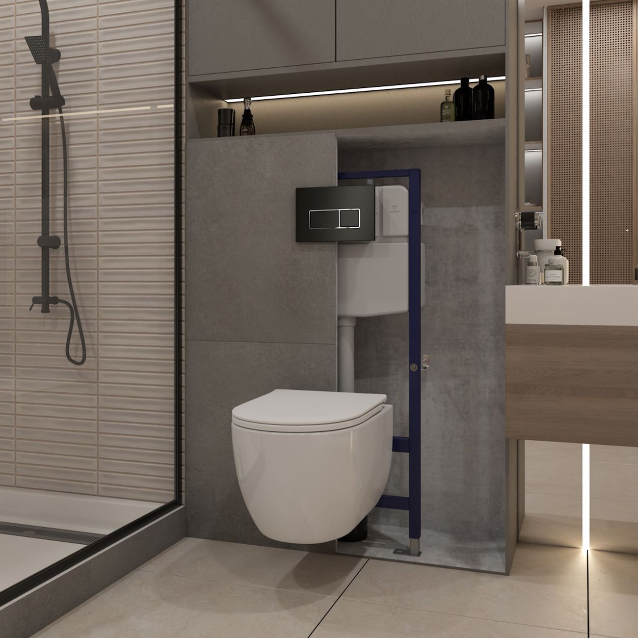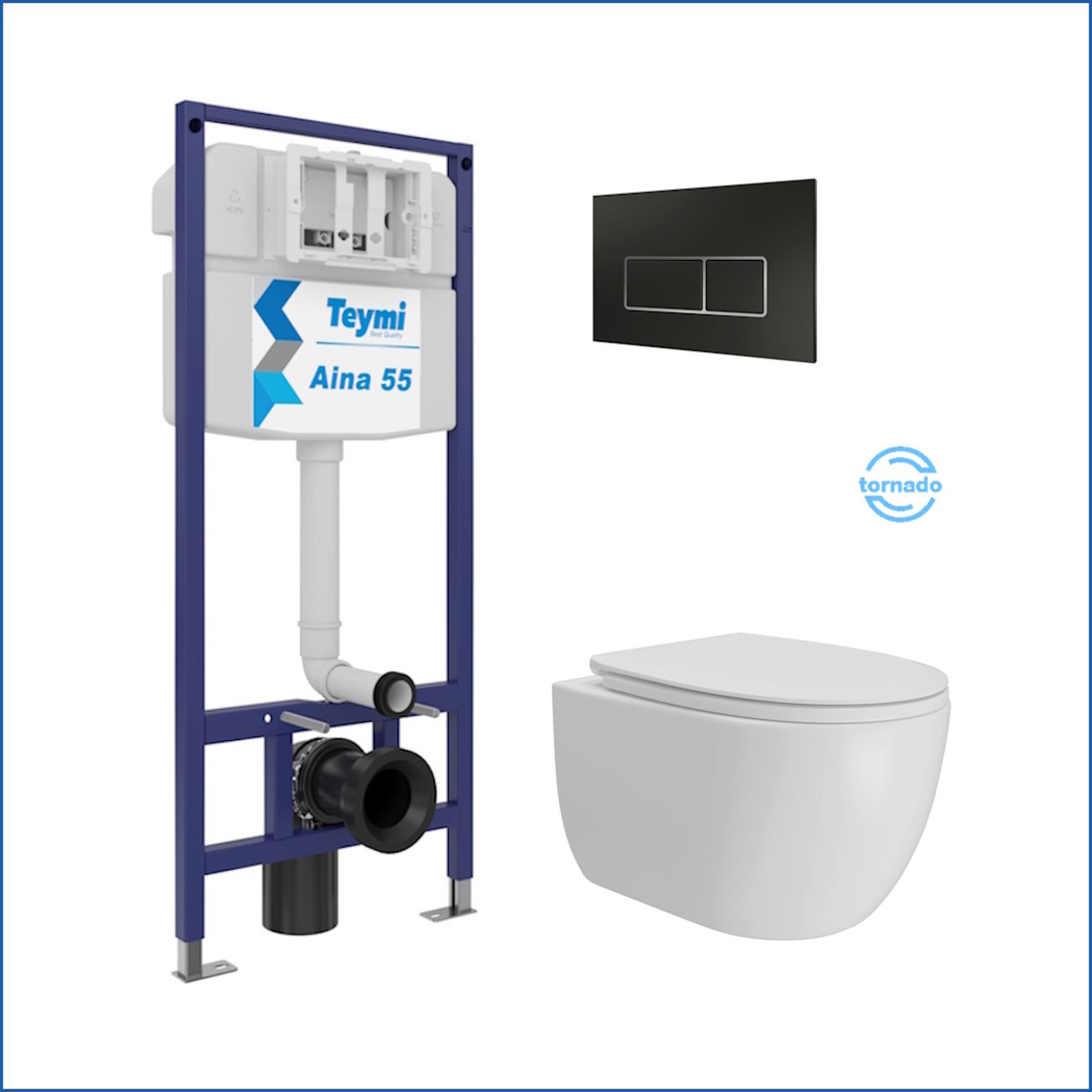 Комплект «Готовое решение» для установки инсталляции с подвесным унитазом: -- инсталляция TEYMI AINA 55 T70035 – монтажная рама из цельного стального профиля прямоугольного сечения, позволяющая выдерживать нагрузки до 400 кг. Габаритная ширина рамы 470 мм; -- цельнолитой бесшовный бачок скрытого монтажа; -- клавиша смыва HELMI черный матовый T70205; -- унитаз подвесной безободковый Teymi Lori Vortex T40502; -- сиденье с микролифтом; -- полный комплект арматуры для монтажа: уплотнительные кольца, манжеты, труба смыва, фановый отвод с удлинителем, защитный кожух ревизионного окна с крепежной рамкой, закрывающей панелью и крышкой; -- полный комплект крепежа для установки: крепеж к стене, шпильки для унитаза, крепежная рамка, соединительные шпильки, толкатели, фиксаторы; -- инструкция по установке и обслуживанию. Преимущества комплекта: -- полная (максимальная) комплектация для установки - больше ничего докупать не придётся; -- все составляющие комплекта идеально подходят друг к другу; -- рама покрыта суперпрочной порошковой краской синего цвета с антикоррозионными свойствами; -- высота монтажной рамы может регулироваться с помощью ножек из оцинкованной стали; -- универсальный монтаж – межосевое расстояние под шпильки для подвесного унитаза 180 и 230 мм – подходит ко всем подвесным унитазам; -- сливной бачок скрытого монтажа, изготовленный из полиэтилена низкого давления, рассчитан на 200 тысяч циклов смыва, а цельнолитая бесшовная конструкция позволит работать без протечек в течение всего периода эксплуатации; -- 2-режимный слив 3 / 6 л с возможностью регулировки; -- лёгкость обслуживания бачка благодаря ревизионному окну, скрытому за клавишей смыва; -- гарантия 10 лет на весь комплект и 50 лет на стальную раму. Размер изделия: высота 1130 мм (регулируется) Х ширина 470 мм Х глубина 102 мм. Уважаемые покупатели, обращаем ваше внимание на то, что система инсталляции TEYMI AINA 55 может быть также укомплектована другими клавишами смыва или подвесными унитазами от бренда TEYMI (вы можете найти их на этом сайте по указанным артикулам). Предлагаем вам рассмотреть варианты сочетания со следующими клавишами: : HELMI хром T70202CH : HELMI черная T70203BM : HELMI белая T70018WM : HELMI нержавеющая сталь T70204 : HELMI черный матовый T70205 : HELMI белый глянцевый T70206 : LINA хром T70102CH : LINA черная T70103BM : LINA белая T70019WM : LINA нержавеющая сталь T70104 : LINA черный матовый T70105 : LINA белый матовый T70106 : AINA хром T70012CH : AINA черная T70013BM : AINA белая T70020WM : AINA нержавеющая сталь T70014 : KATI хром T70701CH : KATI черная T70702BM : KATI белая T70021WM : ELLIE хром T70022CH : ELLIE черная T70023BM : ELLIE белая T70024WM Также просим обратить взгляд на наши лучшие безободковые подвесные унитазы: : SOLLI T40201 : LINA S T40102 : HELMI S T40302 : HELMI VORTEX T40303 : IVA T40601 : ELLIE T40802 : LINA MEDIA T40105 : KATI T40701 : HANNA PRO T40901 : HELMI S BLACK T40302MB : VITRA PRO T40806 : VITRA T40804 : DEMI T40208 : LINA VORTEX T40110 : RITTA T40809 : LINA PRO T40106 : LINA S BLACK T40111