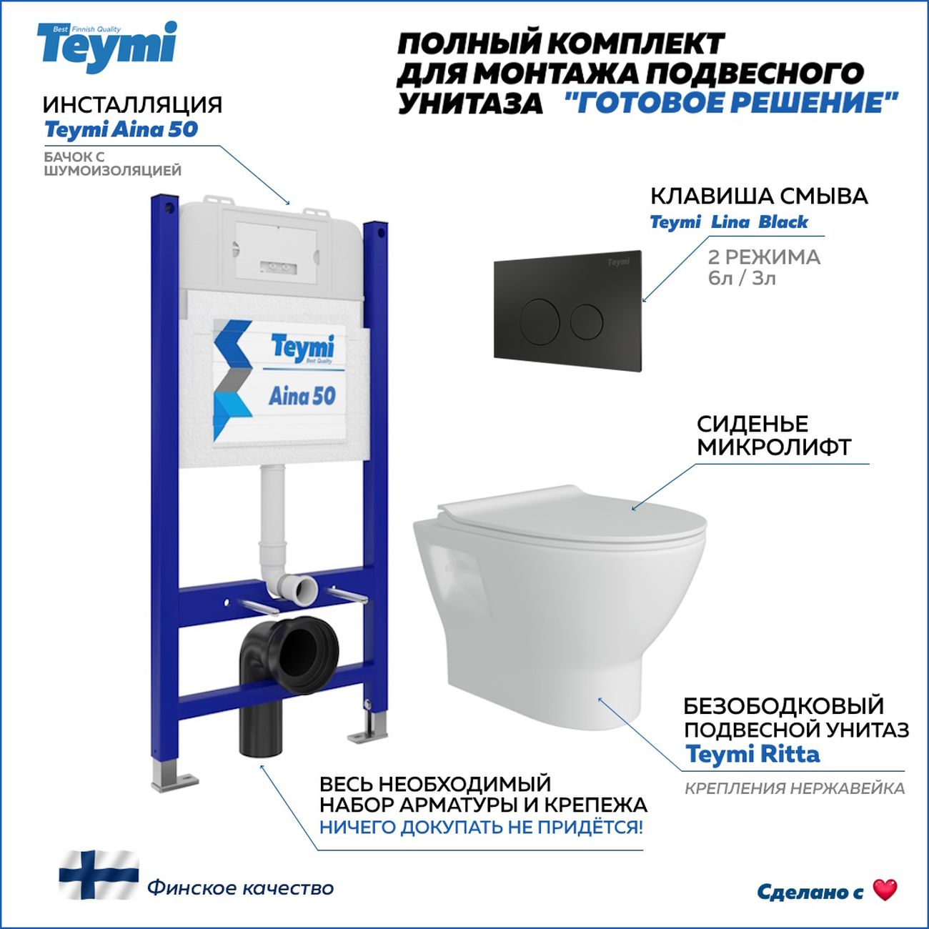 Комплект «Готовое решение» для установки инсталляции с подвесным унитазом: -- инсталляция TEYMI AINA 50 T70033 – монтажная рама из цельного стального профиля прямоугольного сечения, позволяющая выдерживать нагрузки до 400 кг. Габаритная ширина рамы 525 мм; -- клавиша смыва TEYMI LINA T70103BM, цвет ЧЕРНЫЙ МАТОВЫЙ; -- унитаз подвесной безободковый TEYMI RITTA T40809; -- ультратонкое сиденье с микролифтом; -- полный комплект арматуры для монтажа: уплотнительные кольца, манжеты, труба смыва, фановый отвод с удлинителем, защитный кожух ревизионного окна с крепежной рамкой, закрывающей панелью и крышкой; -- полный комплект крепежа для установки: крепеж к стене, шпильки для унитаза, крепежная рамка, соединительные шпильки, толкатели, фиксаторы; -- инструкция по установке и обслуживанию. Преимущества комплекта: -- полная (максимальная) комплектация для установки - больше ничего докупать не придётся; -- все составляющие комплекта идеально подходят друг к другу; -- рама покрыта суперпрочной порошковой краской синего цвета с антикоррозионными свойствами; -- высота монтажной рамы может регулироваться с ходом до 20 см с помощью ножек из оцинкованной стали; -- универсальный монтаж – межосевое расстояние под шпильки для подвесного унитаза 180 и 230 мм – подходит ко всем подвесным унитазам; -- сливной бачок скрытого монтажа, изготовленный из полиэтилена низкого давления, рассчитан на 200 тысяч циклов смыва, а цельнолитая бесшовная конструкция позволит работать без протечек в течение всего периода эксплуатации; -- 2-режимный слив 3 / 6 л с возможностью регулировки; -- лёгкость обслуживания бачка благодаря ревизионному окну, скрытому за клавишей смыва; -- гарантия 10 лет на весь комплект и 50 лет на стальную раму. Размер инсталляции с бачком: высота 1055 мм Х ширина 525 мм Х глубина 96 мм. Уважаемые покупатели, обращаем ваше внимание на то, что система инсталляции TEYMI AINA 50 может быть также укомплектована другими клавишами смыва или подвесными унитазами от бренда TEYMI (вы можете найти их на этом сайте по указанным артикулам). Предлагаем вам рассмотреть варианты сочетания со следующими клавишами: : HELMI хром T70202CH : HELMI черная T70203BM : HELMI белая T70018WM : LINA хром T70102CH : LINA черная T70103BM : LINA белая T70019WM : AINA хром T70012CH : AINA черная T70013BM : AINA белая T70020WM : KATI хром T70701CH : KATI черная T70702BM : KATI белая T70021WM : ELLIE хром T70022CH : ELLIE черная T70023BM : ELLIE белая T70024WM Также просим обратить взгляд на наши лучшие безободковые подвесные унитазы: : SOLLI T40201 : LINA S T40102 : HELMI S T40302 : HELMI VORTEX T40303 : IVA T40601 : ELLIE T40802 : LINA MEDIA T40105 : KATI T40701 : HANNA PRO T40901 : HELMI S BLACK T40302MB : VITRA PRO T40806 : VITRA T40804 : DEMI T40208 : LINA VORTEX T40110 : RITTA T40809 : LINA PRO T40106 : LINA S BLACK T40111