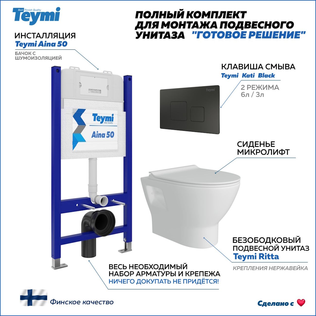 Комплект «Готовое решение» для установки инсталляции с подвесным унитазом: -- инсталляция TEYMI AINA 50 T70033 – монтажная рама из цельного стального профиля прямоугольного сечения, позволяющая выдерживать нагрузки до 400 кг. Габаритная ширина рамы 525 мм; -- клавиша смыва TEYMI KATI T70702BM, цвет ЧЕРНЫЙ МАТОВЫЙ; -- унитаз подвесной безободковый TEYMI RITTA T40809; -- ультратонкое сиденье с микролифтом; -- полный комплект арматуры для монтажа: уплотнительные кольца, манжеты, труба смыва, фановый отвод с удлинителем, защитный кожух ревизионного окна с крепежной рамкой, закрывающей панелью и крышкой; -- полный комплект крепежа для установки: крепеж к стене, шпильки для унитаза, крепежная рамка, соединительные шпильки, толкатели, фиксаторы; -- инструкция по установке и обслуживанию. Преимущества комплекта: -- полная (максимальная) комплектация для установки - больше ничего докупать не придётся; -- все составляющие комплекта идеально подходят друг к другу; -- рама покрыта суперпрочной порошковой краской синего цвета с антикоррозионными свойствами; -- высота монтажной рамы может регулироваться с ходом до 20 см с помощью ножек из оцинкованной стали; -- универсальный монтаж – межосевое расстояние под шпильки для подвесного унитаза 180 и 230 мм – подходит ко всем подвесным унитазам; -- сливной бачок скрытого монтажа, изготовленный из полиэтилена низкого давления, рассчитан на 200 тысяч циклов смыва, а цельнолитая бесшовная конструкция позволит работать без протечек в течение всего периода эксплуатации; -- 2-режимный слив 3 / 6 л с возможностью регулировки; -- лёгкость обслуживания бачка благодаря ревизионному окну, скрытому за клавишей смыва; -- гарантия 10 лет на весь комплект и 50 лет на стальную раму. Размер инсталляции с бачком: высота 1055 мм Х ширина 525 мм Х глубина 96 мм. Уважаемые покупатели, обращаем ваше внимание на то, что система инсталляции TEYMI AINA 50 может быть также укомплектована другими клавишами смыва или подвесными унитазами от бренда TEYMI (вы можете найти их на этом сайте по указанным артикулам). Предлагаем вам рассмотреть варианты сочетания со следующими клавишами: : HELMI хром T70202CH : HELMI черная T70203BM : HELMI белая T70018WM : LINA хром T70102CH : LINA черная T70103BM : LINA белая T70019WM : AINA хром T70012CH : AINA черная T70013BM : AINA белая T70020WM : KATI хром T70701CH : KATI черная T70702BM : KATI белая T70021WM : ELLIE хром T70022CH : ELLIE черная T70023BM : ELLIE белая T70024WM Также просим обратить взгляд на наши лучшие безободковые подвесные унитазы: : SOLLI T40201 : LINA S T40102 : HELMI S T40302 : HELMI VORTEX T40303 : IVA T40601 : ELLIE T40802 : LINA MEDIA T40105 : KATI T40701 : HANNA PRO T40901 : HELMI S BLACK T40302MB : VITRA PRO T40806 : VITRA T40804 : DEMI T40208 : LINA VORTEX T40110 : RITTA T40809 : LINA PRO T40106 : LINA S BLACK T40111