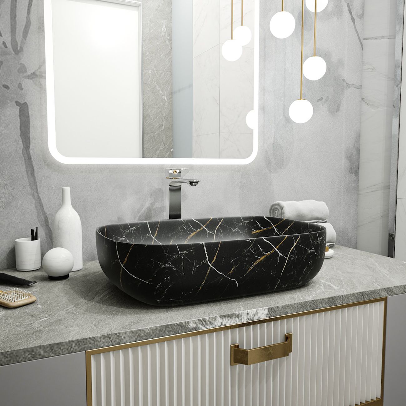 В комплект 2 в 1 входит: 1. Раковина Teymi Solli 60 artceramic, накладная, Черный Мрамор. 2. Донный клапан Teymi для раковины без перелива, черный. Характеристики раковины: -- Артикул производителя: T50399; -- Серия / коллекция: Solli; -- Модель: Solli 60; -- Тип раковины: накладная; -- Установка: на столешницу / на тумбу; -- Возможность встройки: нет; -- Материал изготовления: санфарфор; -- Цвет: черный мрамор; -- Ширина: 610 мм; -- Глубина: 400 мм; -- Высота от столешницы: 145 мм; -- Количество чаш: одна; -- Мыльница: нет; -- Полотенцедержатель: нет; -- Расположение крыла: без крыла; -- Форма: прямоугольная с закруглёнными углами; -- Полочка под смеситель: нет; -- Отверстие под смеситель: нет; -- Отверстие под слив: одно; -- Отверстие под перелив: нет; -- Диаметр сливного отверстия: 45 мм; -- Сливная арматура: в поставку не входит; -- Слив-перелив: в поставку не входит; -- Смеситель: в поставку не входит; Характеристики выпуска: -- Артикул: T140107; -- Материал корпуса: цинк; -- Цвет крышки: черный; -- Покрытие крышки: глянцевое; -- Материал крышки: керамика; -- Материал гайки: латунь; -- Функция клик-клак: да; -- Скорость слива воды: 52 л/мин; -- Диаметр отверстия раковины: 45 мм; Внимание! Смеситель в комплект поставки не входит, его надо приобретать отдельно.