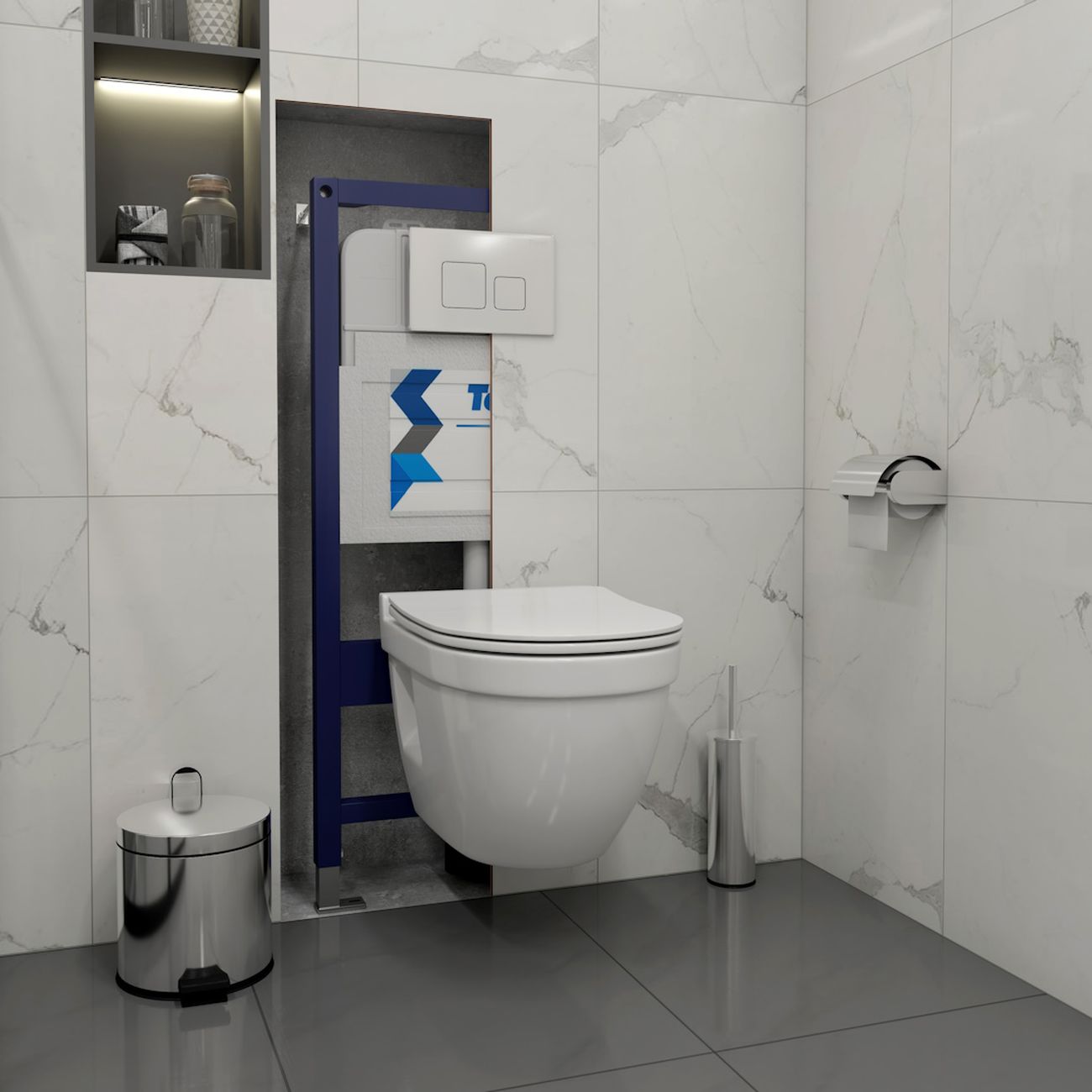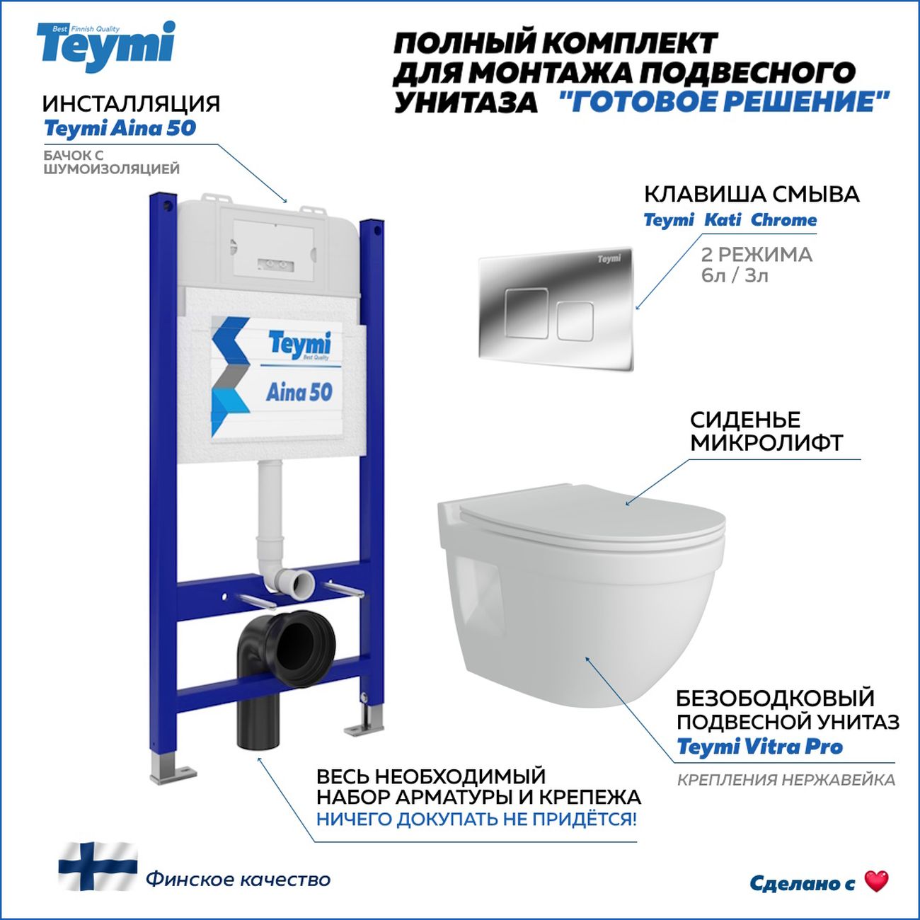 Комплект «Готовое решение» для установки инсталляции с подвесным унитазом: -- инсталляция TEYMI AINA 50 T70033 – монтажная рама из цельного стального профиля прямоугольного сечения, позволяющая выдерживать нагрузки до 400 кг. Габаритная ширина рамы 525 мм; -- клавиша смыва TEYMI KATI T70701CH, цвет ХРОМ ГЛЯНЕЦ; -- унитаз подвесной безободковый TEYMI VITRA PRO T40806; -- сиденье с микролифтом; -- полный комплект арматуры для монтажа: уплотнительные кольца, манжеты, труба смыва, фановый отвод с удлинителем, защитный кожух ревизионного окна с крепежной рамкой, закрывающей панелью и крышкой; -- полный комплект крепежа для установки: крепеж к стене, шпильки для унитаза, крепежная рамка, соединительные шпильки, толкатели, фиксаторы; -- инструкция по установке и обслуживанию. Преимущества комплекта: -- полная (максимальная) комплектация для установки - больше ничего докупать не придётся; -- все составляющие комплекта идеально подходят друг к другу; -- рама покрыта суперпрочной порошковой краской синего цвета с антикоррозионными свойствами; -- высота монтажной рамы может регулироваться с ходом до 20 см с помощью ножек из оцинкованной стали; -- универсальный монтаж – межосевое расстояние под шпильки для подвесного унитаза 180 и 230 мм – подходит ко всем подвесным унитазам; -- сливной бачок скрытого монтажа, изготовленный из полиэтилена низкого давления, рассчитан на 200 тысяч циклов смыва, а цельнолитая бесшовная конструкция позволит работать без протечек в течение всего периода эксплуатации; -- 2-режимный слив 3 / 6 л с возможностью регулировки; -- лёгкость обслуживания бачка благодаря ревизионному окну, скрытому за клавишей смыва; -- гарантия 10 лет на весь комплект и 50 лет на стальную раму. Размер инсталляции с бачком: высота 1055 мм Х ширина 525 мм Х глубина 96 мм. %%%%%%%%%%%%%%%%%% ОТСЕЧКА 2000 ЗБП %%%%%%%%%%%%%%%%%%%% Уважаемые покупатели, обращаем ваше внимание на то, что система инсталляции TEYMI AINA 50 может быть также укомплектована другими клавишами смыва или подвесными унитазами от бренда TEYMI (вы можете найти их на этом сайте по указанным артикулам). Предлагаем вам рассмотреть варианты сочетания со следующими клавишами: : HELMI хром T70202CH : HELMI черная T70203BM : HELMI белая T70018WM : LINA хром T70102CH : LINA черная T70103BM : LINA белая T70019WM : AINA хром T70012CH : AINA черная T70013BM : AINA белая T70020WM : KATI хром T70701CH : KATI черная T70702BM : KATI белая T70021WM : ELLIE хром T70022CH : ELLIE черная T70023BM : ELLIE белая T70024WM Также просим обратить взгляд на наши лучшие безободковые подвесные унитазы: : SOLLI T40201 : LINA S T40102 : HELMI S T40302 : HELMI VORTEX T40303 : IVA T40601 : ELLIE T40802 : LINA MEDIA T40105 : KATI T40701 : HANNA PRO T40901 : HELMI S BLACK T40302MB : VITRA PRO T40806 : VITRA T40804 : DEMI T40208 : LINA VORTEX T40110 : RITTA T40809 : LINA PRO T40106 : LINA S BLACK T40111