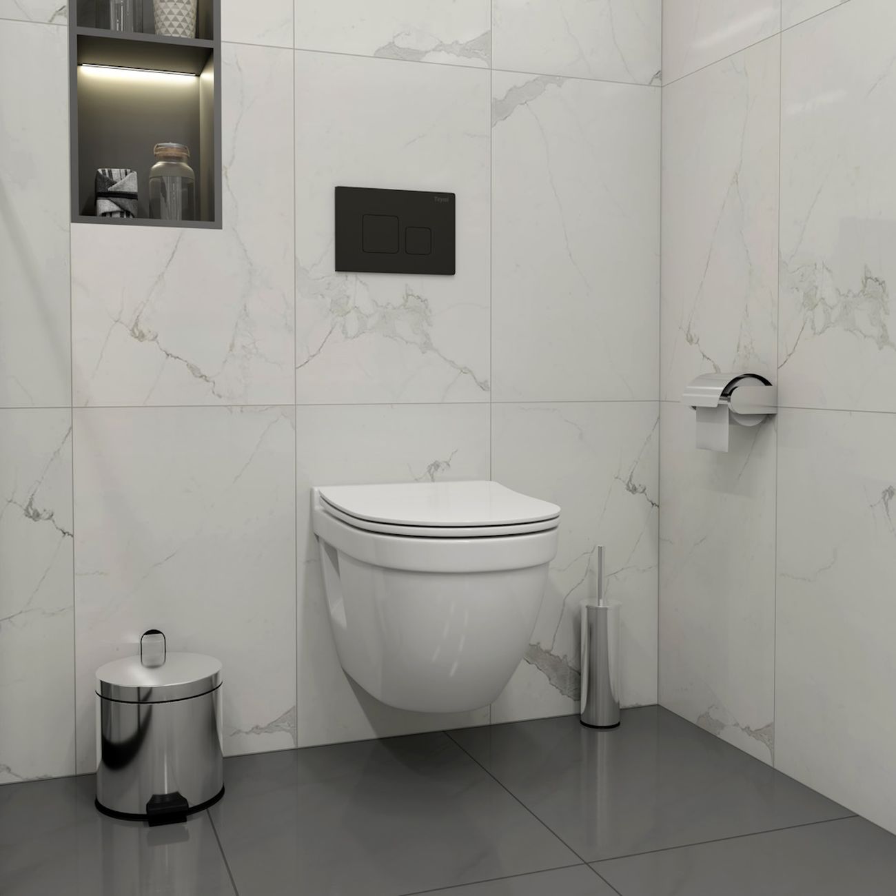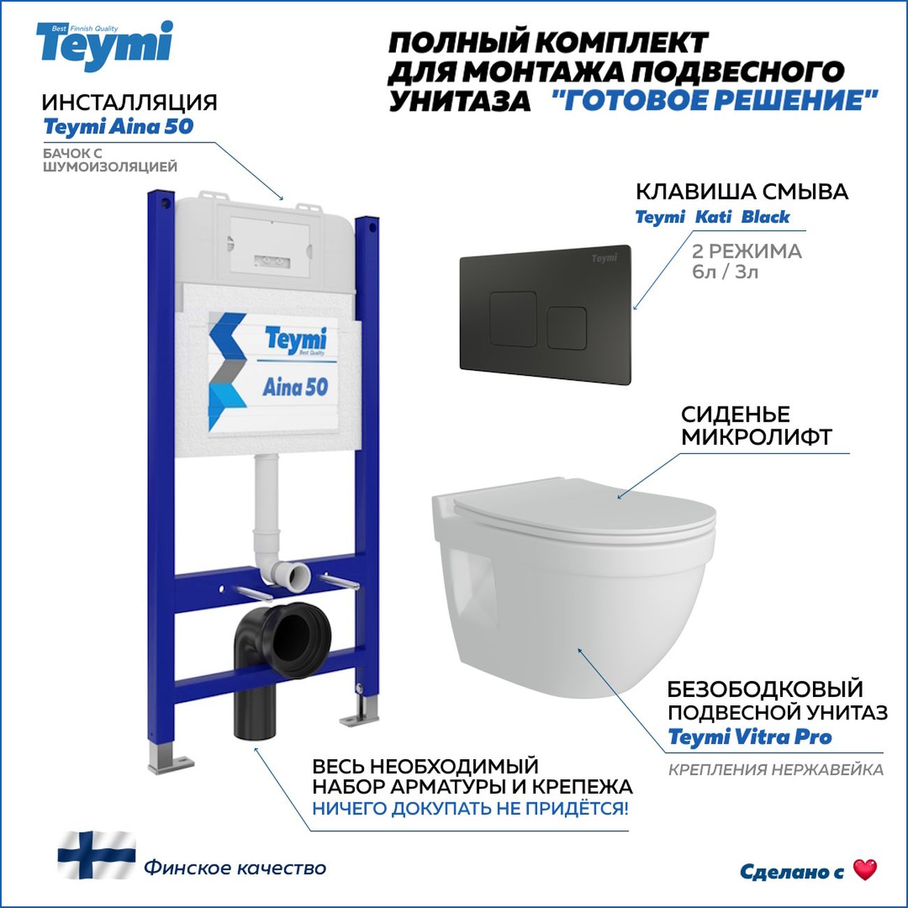 Комплект «Готовое решение» для установки инсталляции с подвесным унитазом: -- инсталляция TEYMI AINA 50 T70033 – монтажная рама из цельного стального профиля прямоугольного сечения, позволяющая выдерживать нагрузки до 400 кг. Габаритная ширина рамы 525 мм; -- клавиша смыва TEYMI KATI T70702BM, цвет ЧЕРНЫЙ МАТОВЫЙ; -- унитаз подвесной безободковый TEYMI VITRA PRO T40806; -- сиденье с микролифтом; -- полный комплект арматуры для монтажа: уплотнительные кольца, манжеты, труба смыва, фановый отвод с удлинителем, защитный кожух ревизионного окна с крепежной рамкой, закрывающей панелью и крышкой; -- полный комплект крепежа для установки: крепеж к стене, шпильки для унитаза, крепежная рамка, соединительные шпильки, толкатели, фиксаторы; -- инструкция по установке и обслуживанию. Преимущества комплекта: -- полная (максимальная) комплектация для установки - больше ничего докупать не придётся; -- все составляющие комплекта идеально подходят друг к другу; -- рама покрыта суперпрочной порошковой краской синего цвета с антикоррозионными свойствами; -- высота монтажной рамы может регулироваться с ходом до 20 см с помощью ножек из оцинкованной стали; -- универсальный монтаж – межосевое расстояние под шпильки для подвесного унитаза 180 и 230 мм – подходит ко всем подвесным унитазам; -- сливной бачок скрытого монтажа, изготовленный из полиэтилена низкого давления, рассчитан на 200 тысяч циклов смыва, а цельнолитая бесшовная конструкция позволит работать без протечек в течение всего периода эксплуатации; -- 2-режимный слив 3 / 6 л с возможностью регулировки; -- лёгкость обслуживания бачка благодаря ревизионному окну, скрытому за клавишей смыва; -- гарантия 10 лет на весь комплект и 50 лет на стальную раму. Размер инсталляции с бачком: высота 1055 мм Х ширина 525 мм Х глубина 96 мм. %%%%%%%%%%%%%%%%%% ОТСЕЧКА 2000 ЗБП %%%%%%%%%%%%%%%%%%%% Уважаемые покупатели, обращаем ваше внимание на то, что система инсталляции TEYMI AINA 50 может быть также укомплектована другими клавишами смыва или подвесными унитазами от бренда TEYMI (вы можете найти их на этом сайте по указанным артикулам). Предлагаем вам рассмотреть варианты сочетания со следующими клавишами: : HELMI хром T70202CH : HELMI черная T70203BM : HELMI белая T70018WM : LINA хром T70102CH : LINA черная T70103BM : LINA белая T70019WM : AINA хром T70012CH : AINA черная T70013BM : AINA белая T70020WM : KATI хром T70701CH : KATI черная T70702BM : KATI белая T70021WM : ELLIE хром T70022CH : ELLIE черная T70023BM : ELLIE белая T70024WM Также просим обратить взгляд на наши лучшие безободковые подвесные унитазы: : SOLLI T40201 : LINA S T40102 : HELMI S T40302 : HELMI VORTEX T40303 : IVA T40601 : ELLIE T40802 : LINA MEDIA T40105 : KATI T40701 : HANNA PRO T40901 : HELMI S BLACK T40302MB : VITRA PRO T40806 : VITRA T40804 : DEMI T40208 : LINA VORTEX T40110 : RITTA T40809 : LINA PRO T40106 : LINA S BLACK T40111