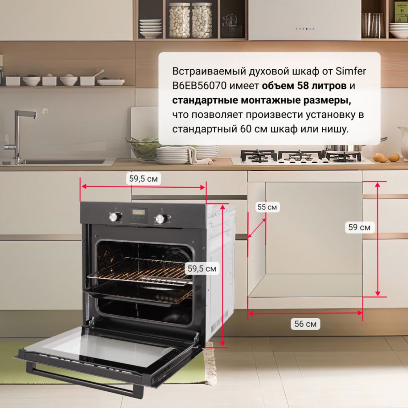 В комплект кухонной техники Simfer S66B000 входят независимые электрические варочная панель H60D14B000 (5,5х60х52 см) и духовой шкаф B6EB56070 (59,5х59,5х56,5 см). Они устанавливаются в ниши размером 5,7х56х49 см и 59х56х55 см соответственно. Устройства оснащены сенсорной и механической панелями управления.