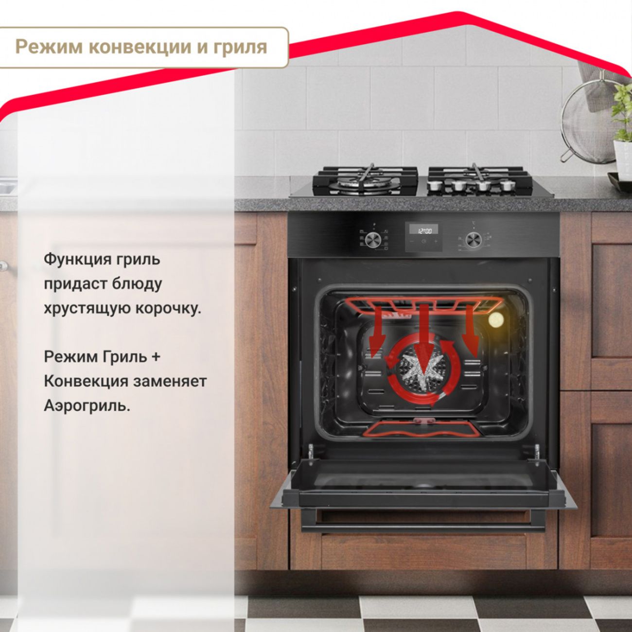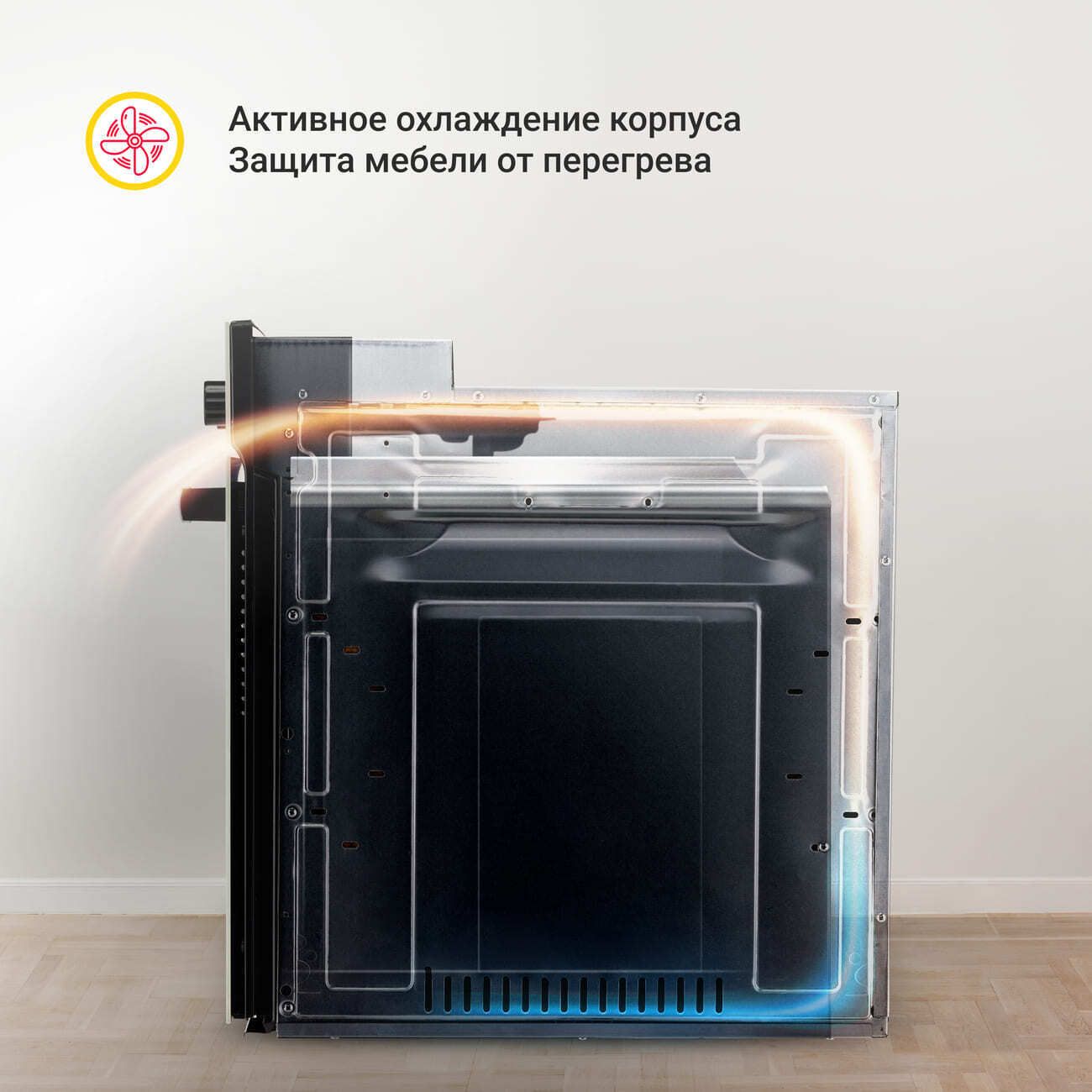 Духовка обладает камерой объемом 58 л, оборудована дверцей из двухслойного термостойкого стекла, открывается вниз. Стенки сделаны из эмалированной стали. Прибор работает в семи режимах, включая гриль, с максимальной температурой нагрева 240°С. Эта модель оснащена встроенными часами с таймером (до 24 часов), металлическими направляющими, лампой накаливания.