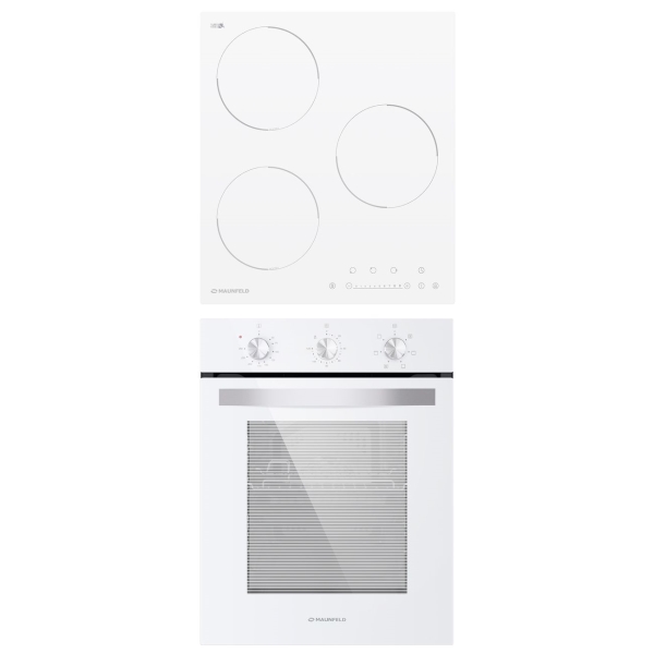 В комплект встраиваемой техники Maunfeld серии Vienna входят электрический духовой шкаф EOEC516W и индукционная варочная панель EVI.453-WH. Устройства выполнены в черном цвете, монтируются независимо друг от друга в ниши размером 60х42х54,5 см и 45х51 см соответственно.