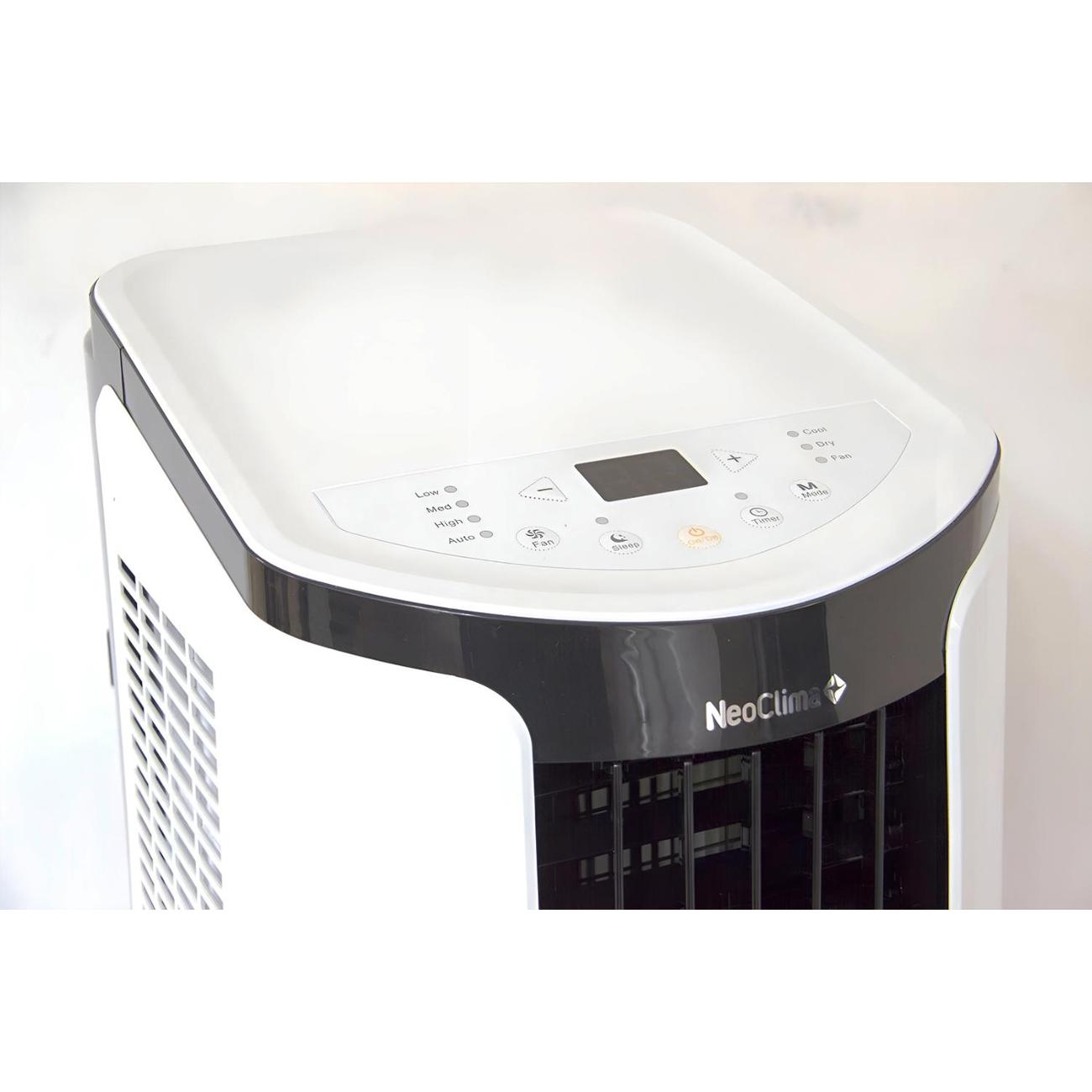 Мобильный кондиционер Neoclima NPAC-07CG оборудован LED-дисплеем, на котором отображается выбранный температурный режим работы. Доступно три скорости подачи воздуха: 320, 290 и 260 м³/ч. Сверху размещена электронная панель управления. Уровень шума устройства не превышает 51 дБ. Максимальная производительность по холоду достигает 2,05 кВт.