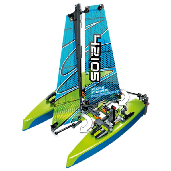 Игрушка разработана с учётом всех особенностей морского судна. Оно оснащено двумя парусами, выдвижным килем и рулём для управления. Модель можно использовать для игр в ванной или на природе для достижения реалистичного эффекта. Катамаран трансформируется по желанию создателя и меняет внешний вид.