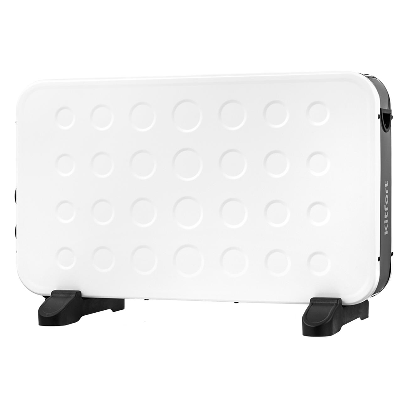 Конвектор Kitfort КТ-2704 с кабелем длиной 1,4 м питается от стандартной электросети с напряжением 220 В. Модель оптимальна для помещений площадью до 20 м². Два встроенных поворотных регулятора позволяют выбрать оптимальную температуру с помощью механического термостата и одну из двух мощностей — 1800 или 2000 Вт.