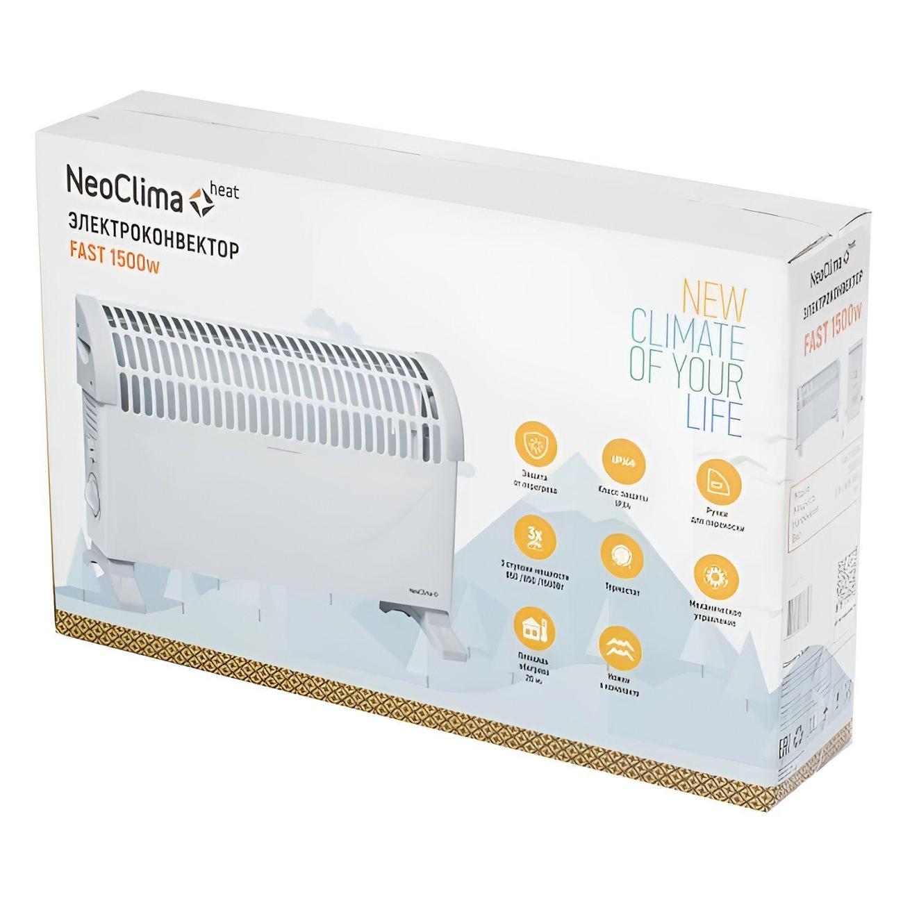 Конвектор Neoclima Fast 1500w нагревается моментально — достаточно 15-20 секунд для достижения оптимальных значений. Температура поддерживается автоматически, что обеспечивает удобство эксплуатации. Доступно три режима — мощностью 0,65 кВт, 0,85 кВт и 1,5 кВт. Механический блок управления отличается интуитивно понятным обозначением. Модель со встроенными СТИЧем и термостатом питается от сети за счет провода длиной 1,5 м. В случае перегрева происходит автоотключение, что гарантирует безопасность.