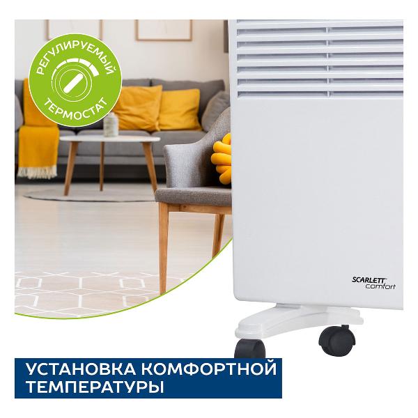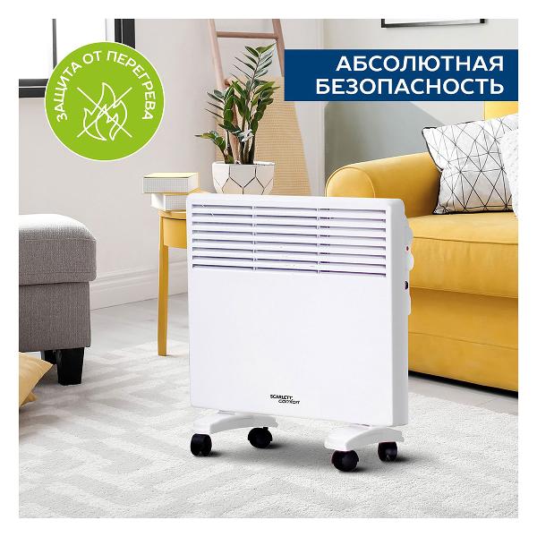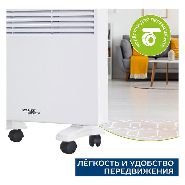 Конвектор Scarlett SCA H VER31 1500 оснащен колесиками для удобства перемещения. В комплекте идут ножки для напольного размещения и крепежи для настенного монтажа. Рекомендуемая площадь обогрева составляет 20 м². Работает от бытовой электрической сети, длина кабеля питания — 1,3 м. Управление температурным режимом осуществляется при помощи поворотного переключателя. Встроена индикация включения и работы. Корпус конвектора выполнен из металла, устойчивого к появлению коррозии и механическим повреждениям. Устройство можно ставить в ванной комнате благодаря защите от влаги IPX0. При опрокидывании и перегреве происходит автоматическое отключение.