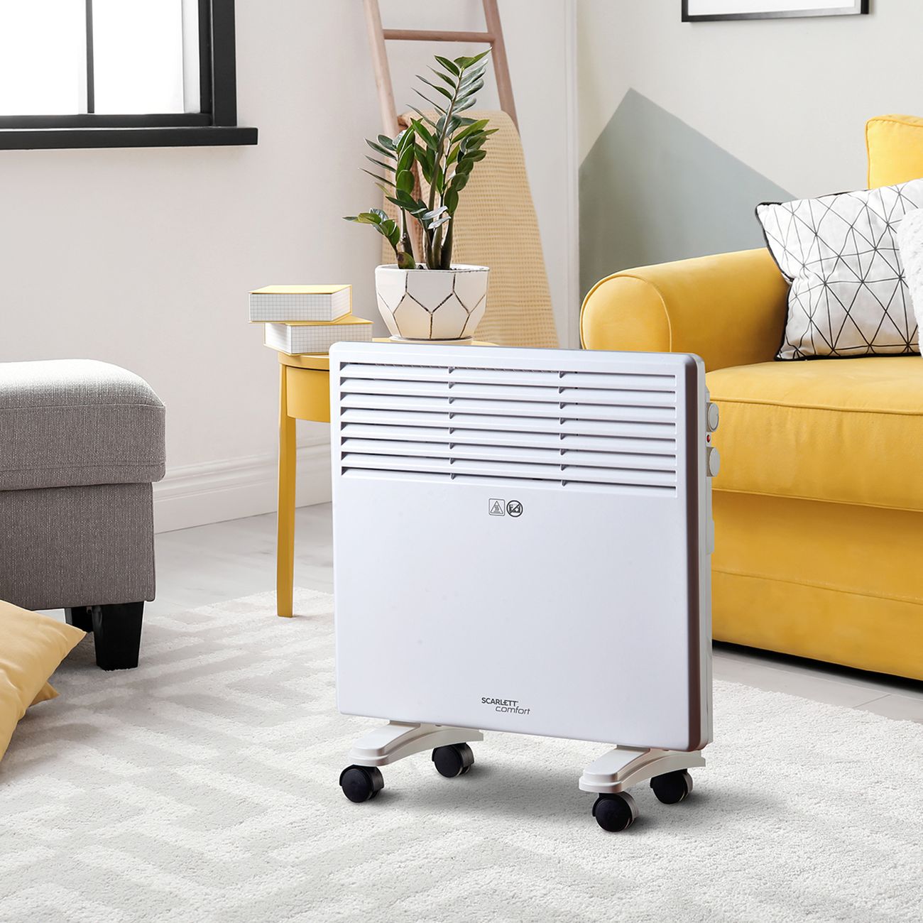 обогревает эффективно, тепло во всей комнате. Колесики удобные, легко конвектор переместить в нужное место .Автоматически поддерживает температуру в гостиной, ни разу не перегрелся. На полной мощности включаем только вначале, переключатели хорошо работают. Тепло по комнате быстро распространяется. Шасси маневренные, легко перемещать. Надежный конвектор, простой нейтральный дизайн, два режима мощности. Температуру установленную держит точно. Воздух комфортный. Хорошо обогревает комнату, комфортно тепло переносится, не сильно затратно свет потребляет и аккуратно сделан. При включении всегда горит индикация.