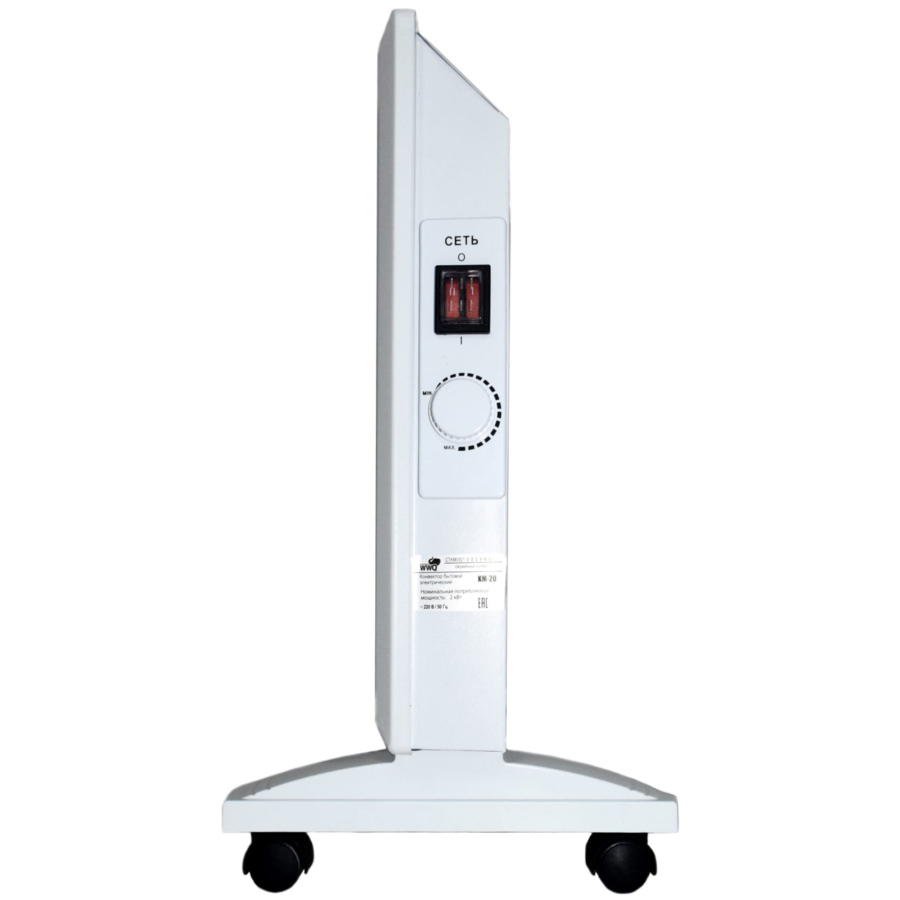Конвектор WWQ KM-20 представлен в классическом белом цвете. Модель устанавливается на ровное напольное покрытие или крепится к стене. Световой индикатор оповестит о готовности устройства к работе. Прибор функционирует от сети с напряжением 220 В.