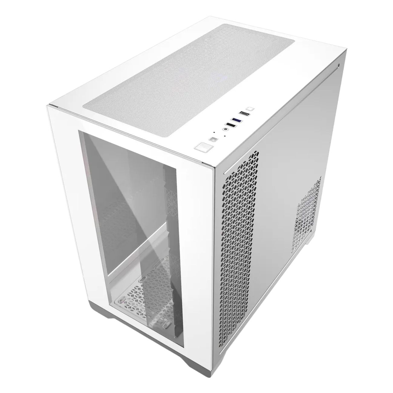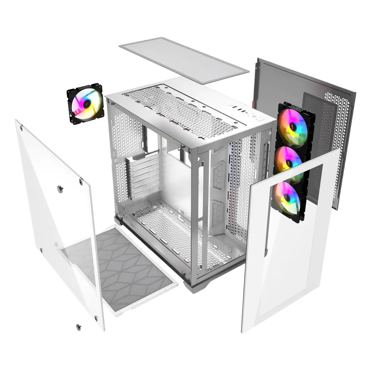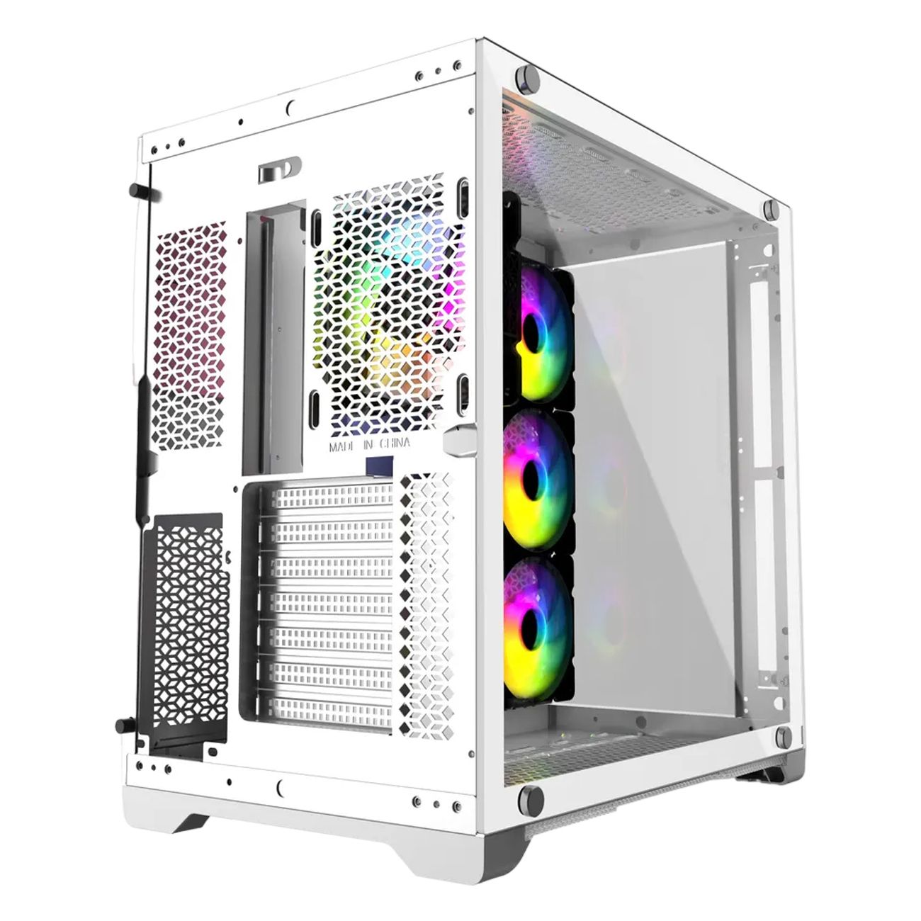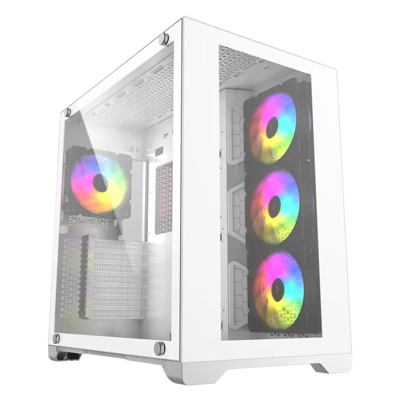 Корпус для компьютера Powercase PC_CVWA_L4 оборудован разноцветной подсветкой внутренних компонентов. Снизу находится отсек для размещения блока питания. Основная часть каркаса выполнена из прочных металла и пластика, боковая и фронтальная панель сделаны из стекла. Встроено четыре вентилятора диаметром 120 мм для дополнительного охлаждения системы. Можно установить процессорный кулер высотой не более 163 мм