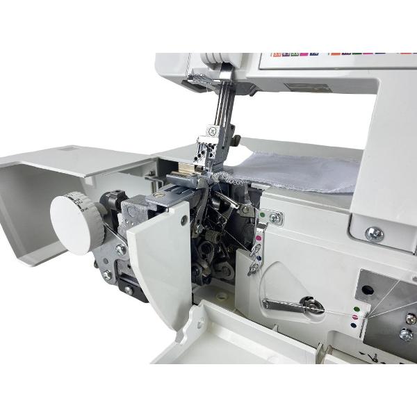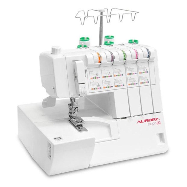 Коверлок Aurora 5000D с максимальной скоростью шитья 1200 стежков в минуту объединяет функции оверлока и распошивальной машины. Он обладает электромеханическим типом управления и обрабатывает ткани любой плотности, включая тяжелые и сложенные в несколько слоев. Прибор мощностью 120 Вт рассчитан на использование двух, трех, четырех, пяти нитей с ручным контролем натяжения. Заправка петлителей (нижнего и цепного стежка) происходит автоматически.