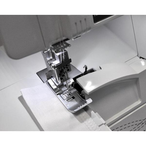 Коверлок позволяет выполнять пятиниточные стачивающе-обметывающие швы. Натяжение нити ручное. Цветовая система заправки нитей облегчает использование прибора. Доступна регулировка длины стежка до 4 мм. Максимальная ширина шва достигает 8,5 мм. Двигатель мощностью 120 Вт обеспечивает скорость шитья до 1000 об/мин.