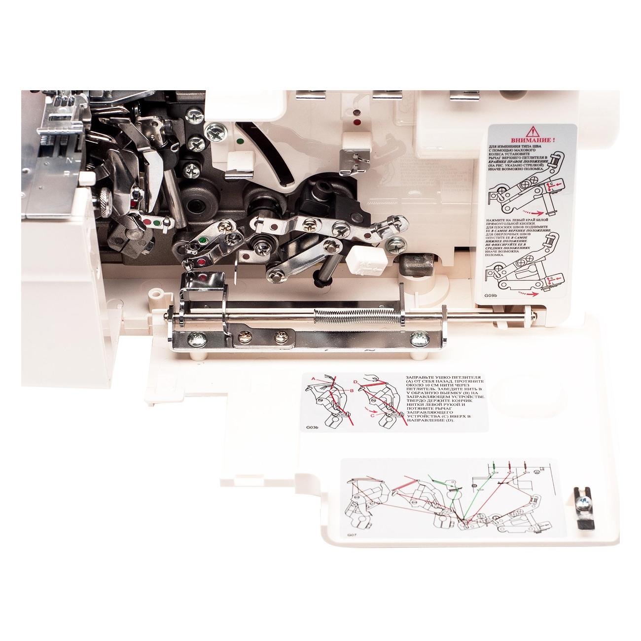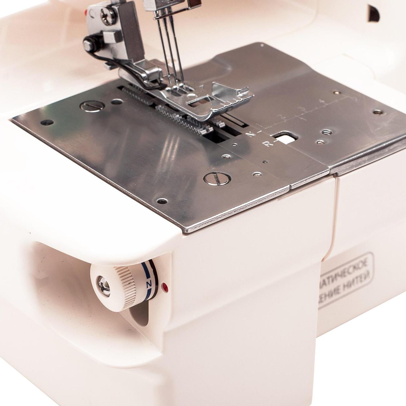 Установлено галогеновое освещение, которое служит для подсветки рабочей зоны. Высота подъема лапки доходит до 4,5 мм. Возможна плавная регулировка скорости шитья. Длина стежка регулируется в пределах 1-4 мм, что позволяет справиться с задачами разного типа. Установлены встроенный двухниточный конвертер и рычаг, который отвечает за снятие натяжения нитей. Можно менять давление лапки на ткань.