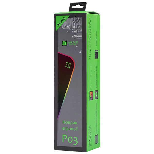 Коврик для мыши Harper Gaming ArtPAD P03 прямоугольной формы, окрашенный в серый и зеленый цвета, можно подключать к ПК при помощи разъема USB. Внешняя часть изготовлена из микроволокна. Это обеспечивает бесперебойную работу модели с использованием оптического или лазерного сенсора. Коврик помогает делать функционирование курсора наиболее точным. Основная область произведена из каучука, за счет чего происходит хорошее фиксирование с гладкой ровной поверхностью. Коврик обладает яркой подсветкой, поддерживающей несколько цветов. Габариты модели — 3х300х770 мм.