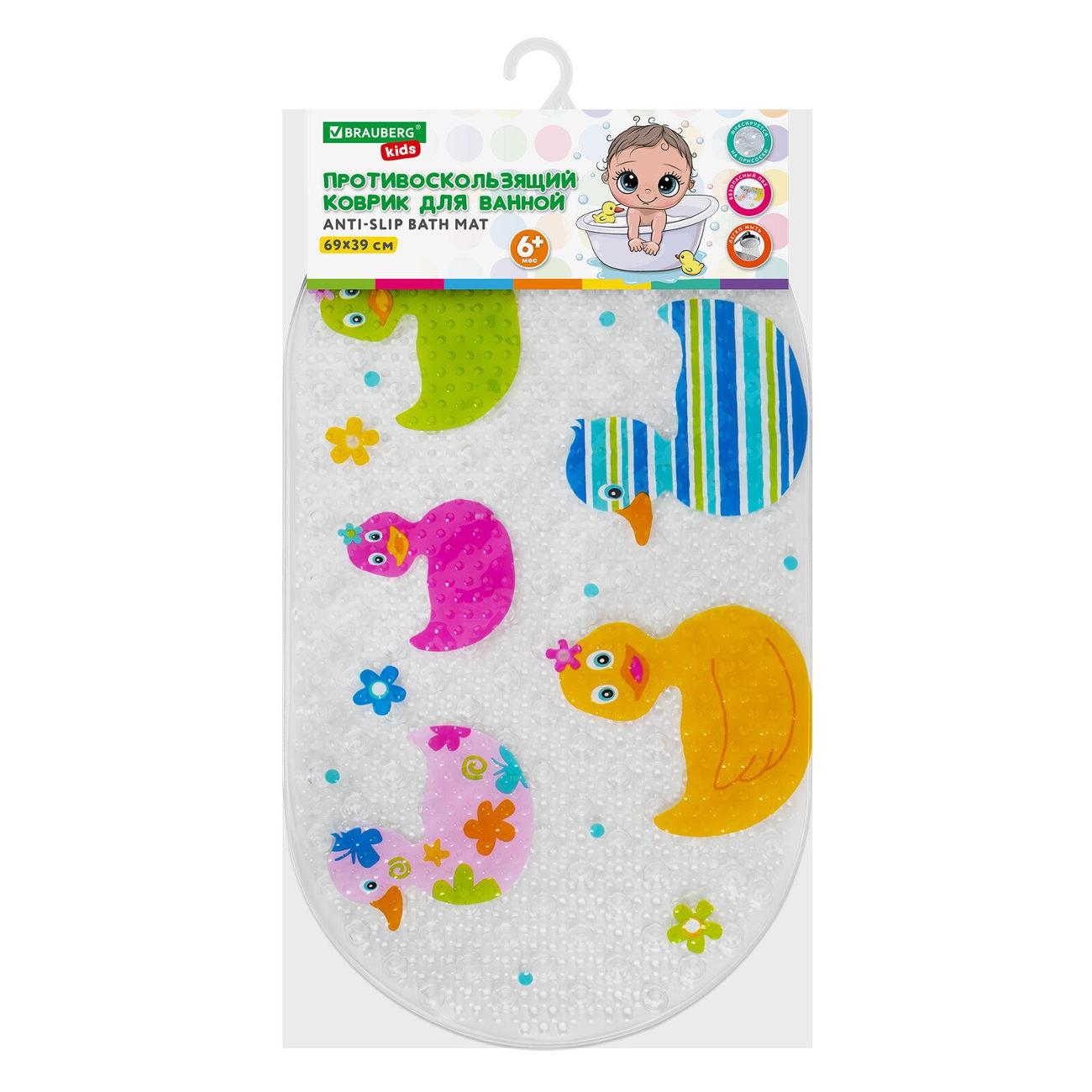 Резиновый противоскользящий большой коврик для ванной BRAUBERG KIDS представляет собой коврик из ПВХ размером 69х36 см с ярким рисунком в виде уточек, с присосками на обратной стороне, которые крепко фиксируют коврик на поверхности ванны.