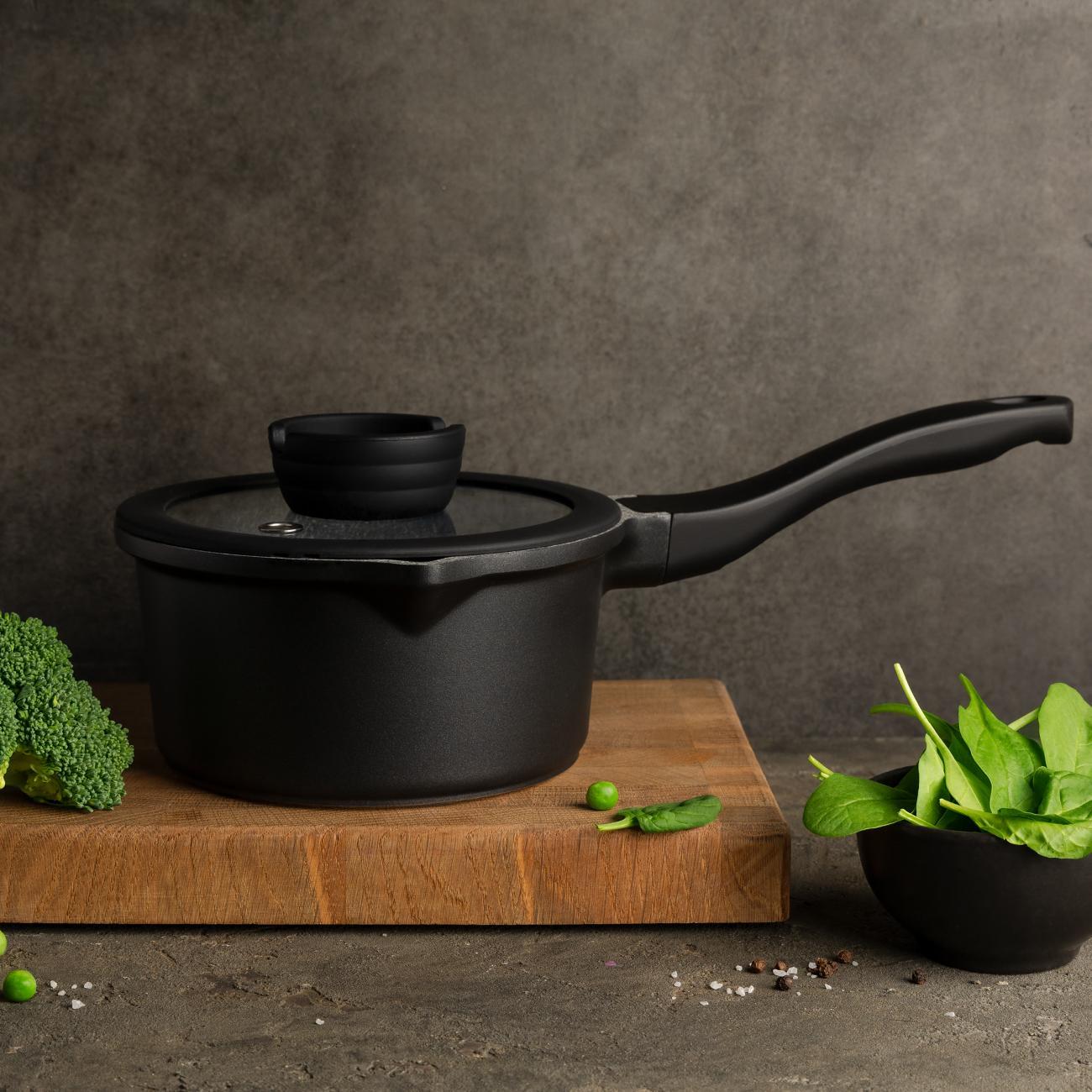 Дно быстро и равномерно прогревается. Корпус из литого алюминия устойчив к механическим и ударным нагрузкам. Через прозрачную стеклянную крышку с клапаном для выпуска пара можно наблюдать за процессом приготовления блюд. Изделие можно мыть вручную или в посудомоечной машине.