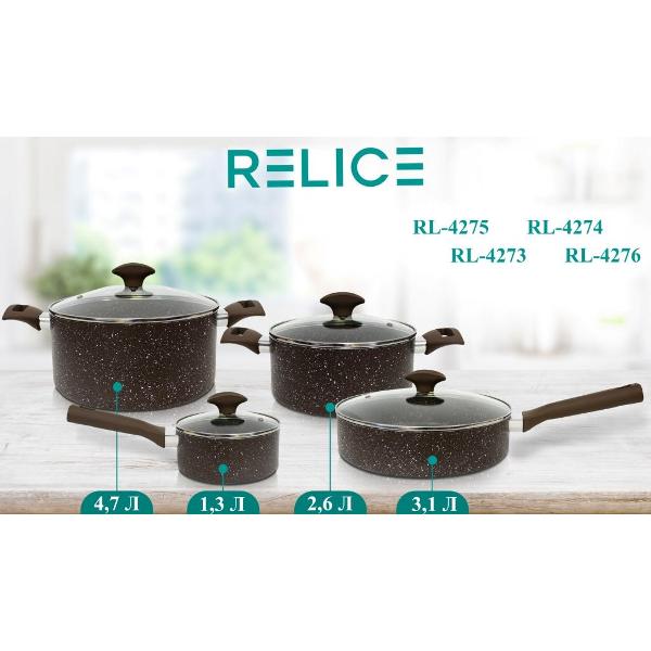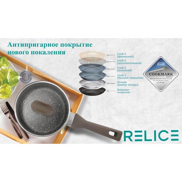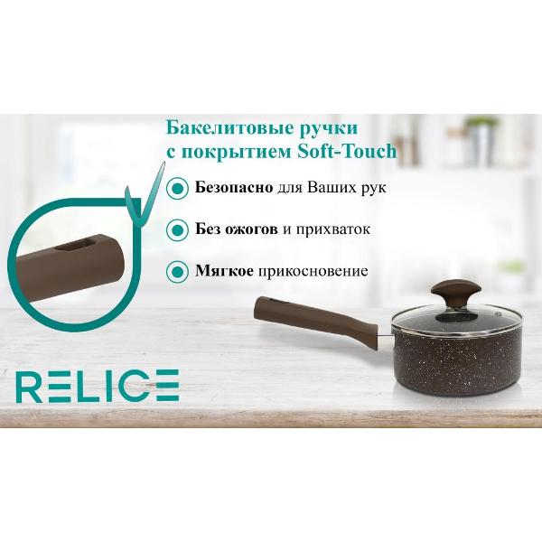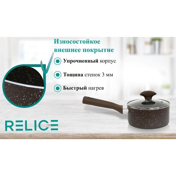 Ковш Relice диаметром 16 см, габаритами 6х17,5х33 см, с толщиной стенок 3 мм может использоваться на всех типах плит. Эргономичная рукоять не проскальзывает и не нагревается при работе, поскольку выполнена из бакелита. Отверстие для подвеса в верхней части дает возможность хранить посуду компактно, на кухонном рейлинге.