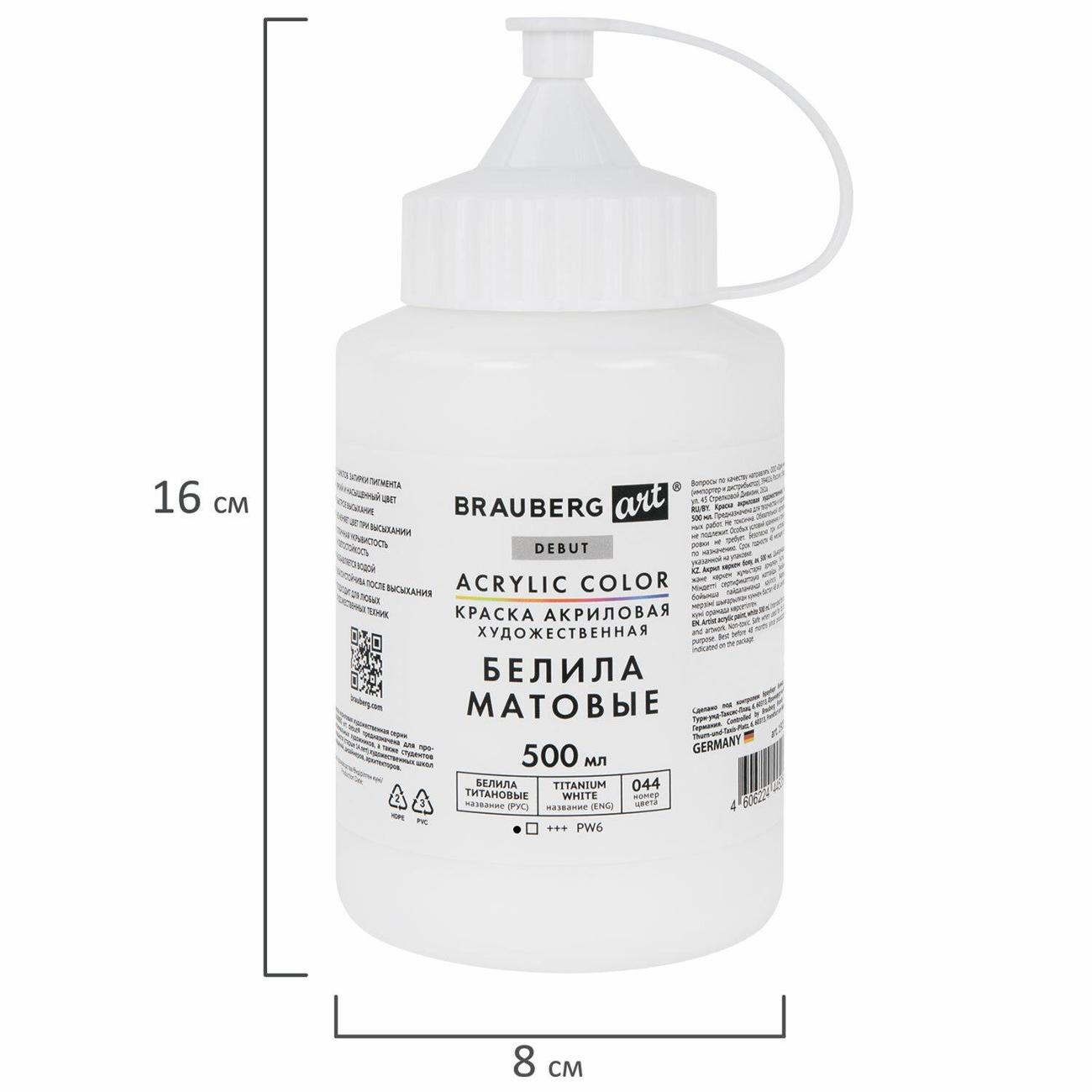 Белила титановые - это насыщенный белый цвет с матовым финишем. Быстрое высыхание без изменения цвета. Отличная укрывистость и светостойкость. Прекрасно смешивается. Благодаря высокой покрывающей способности для достижения оптимального эффекта достаточно нанести всего один слой краски. Разбавляется водой. Температурные пределы транспортирования и хранения - не ниже 0 градусов. Удобный дозировочный клапан. Не токсична и не имеет неприятного резкого запаха. Поставляется в пластиковой банке объемом 500 мл.