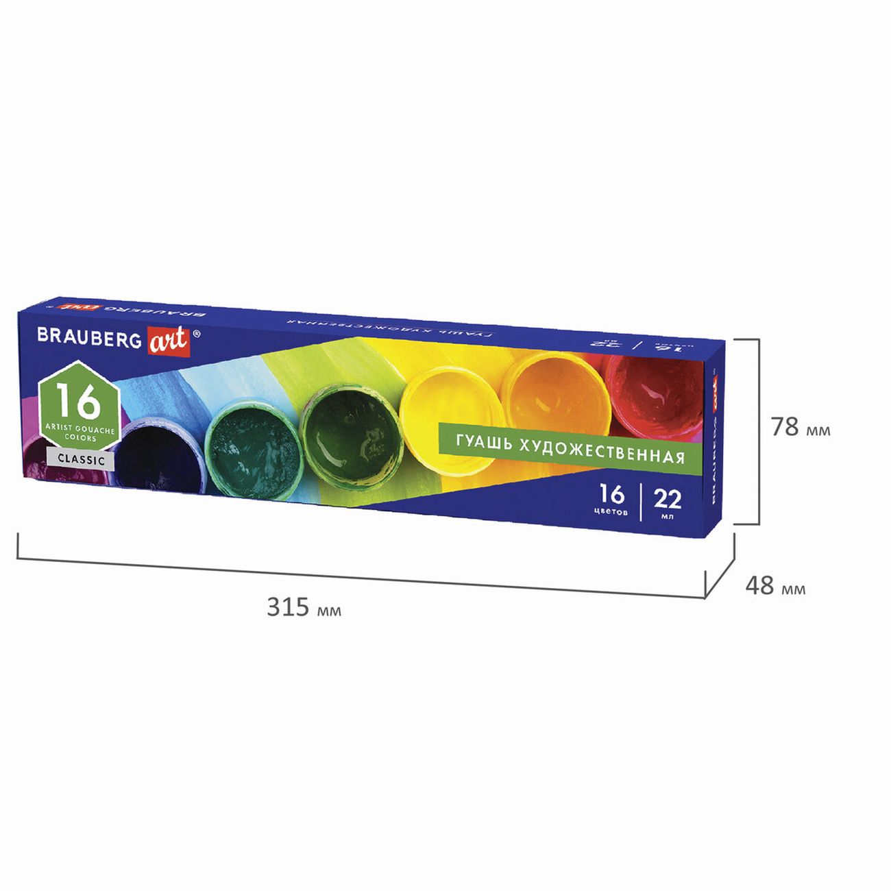 Гуашь Brauberg, 16 цветов по 22 мл отличается высокой светостойкостью и укрывистостью. Основой выступает гуммиарабик.