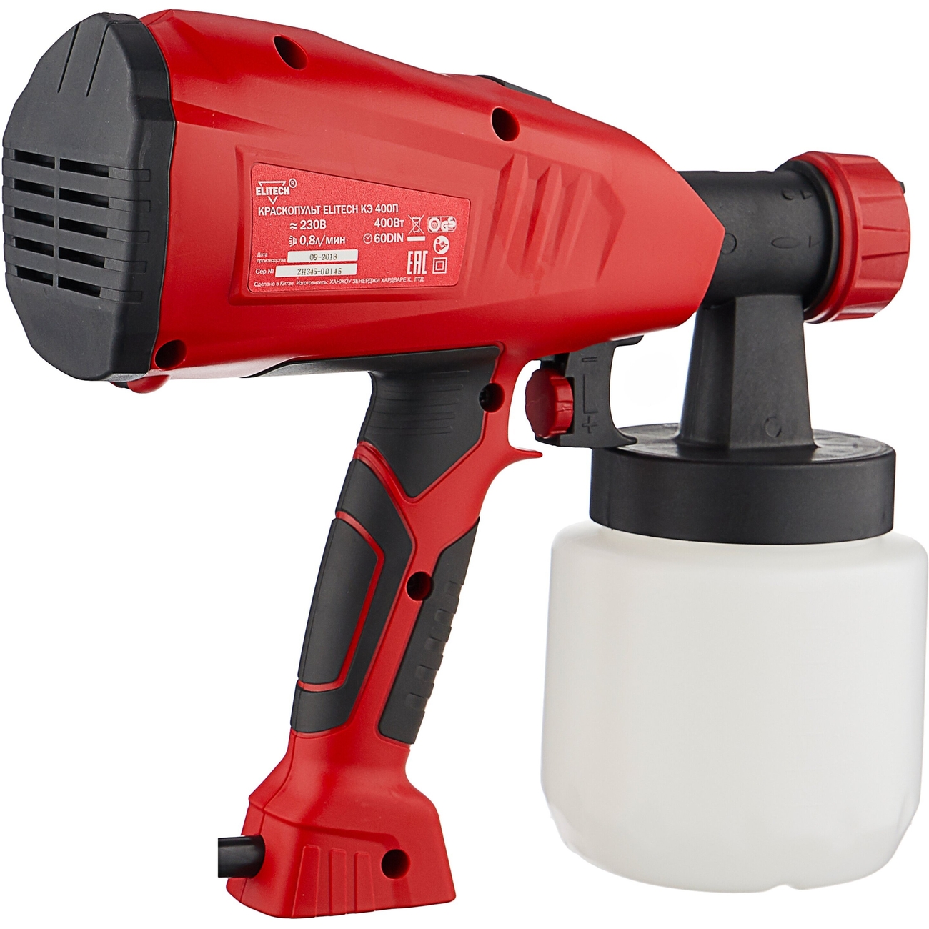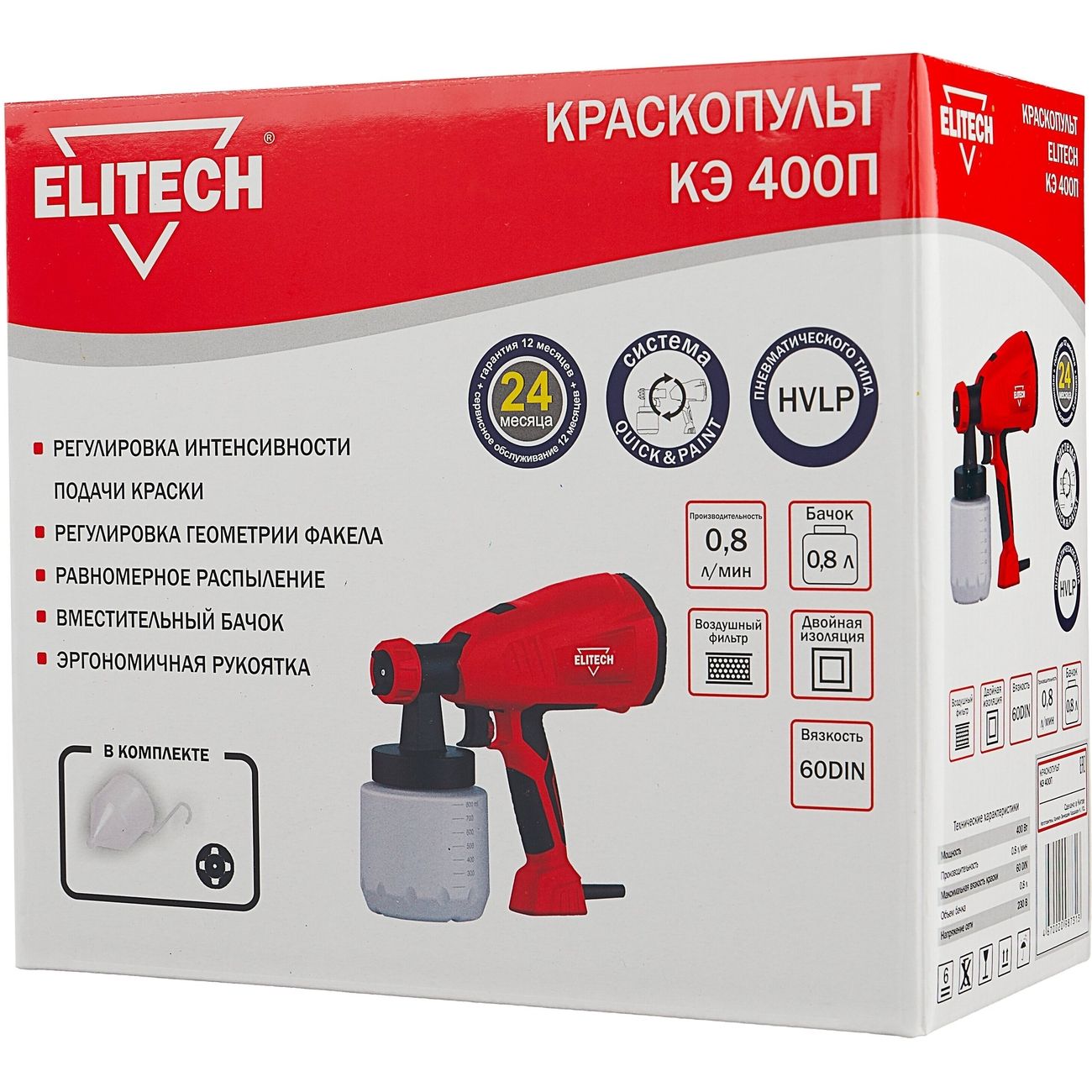Краскопульт Elitech КЭ 400П — компактный инструмент для распыления ЛКМ, удобрений, древо-защитных средств и других текучих жидкостей. Работает от сети 220 В. Объем бачка — 0,8 л, мощность — 400 Вт. Размер и форма факела распыления регулируются поворотом специального кольца на конце сопла. Длина кабеля — 2 м.