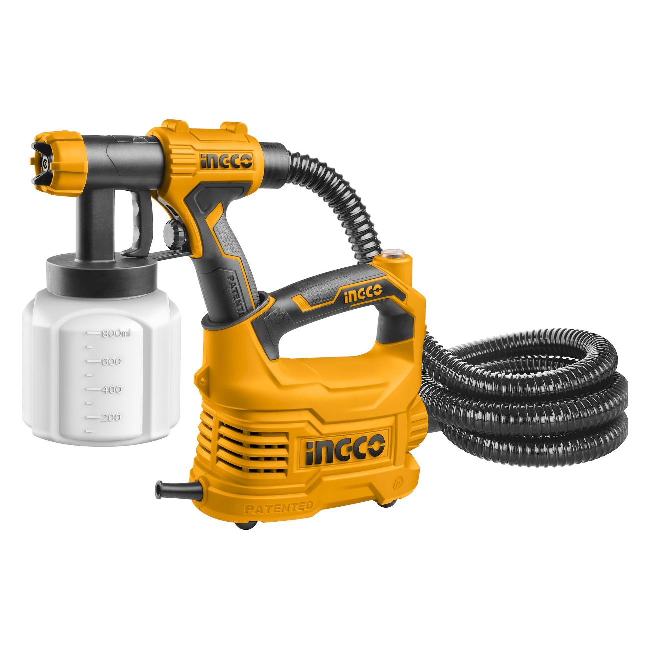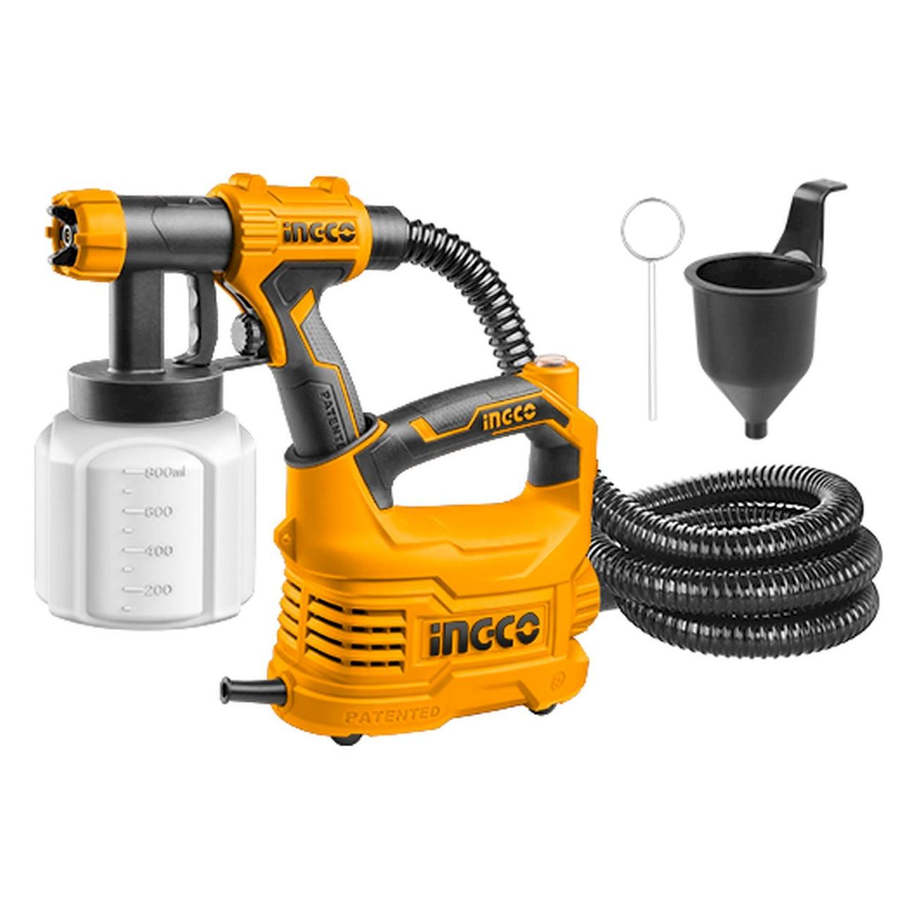 Краскопульт Ingco SPG5008 в черно-оранжевом корпусе работает от электрической сети и потребляет 500 Вт. Его производительность составляет 850 мл/мин. Модель оснащена металлическим резервуаром объемом 800 мл, который располагается снизу. В него можно заливать эмаль, акриловую, масляную и водоэмульсионную краску, лак и грунтовку. Диаметр сопла краскопульта составляет 2,5 мм. Длина шланга — 190 см. Корпус у краскопульта пластиковый. В комплект входят плечевой ремень и игла для прочистки сопла.