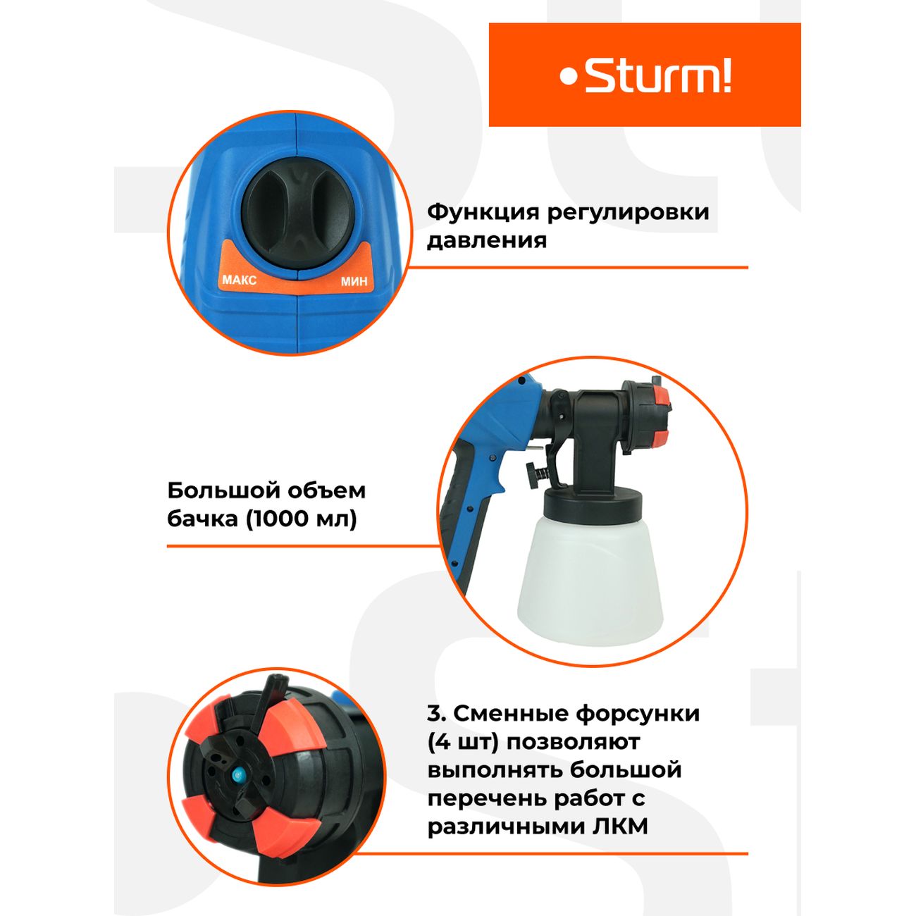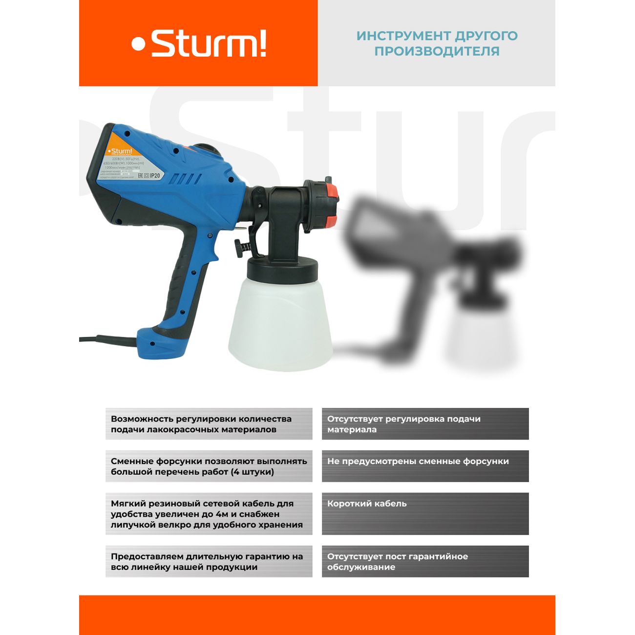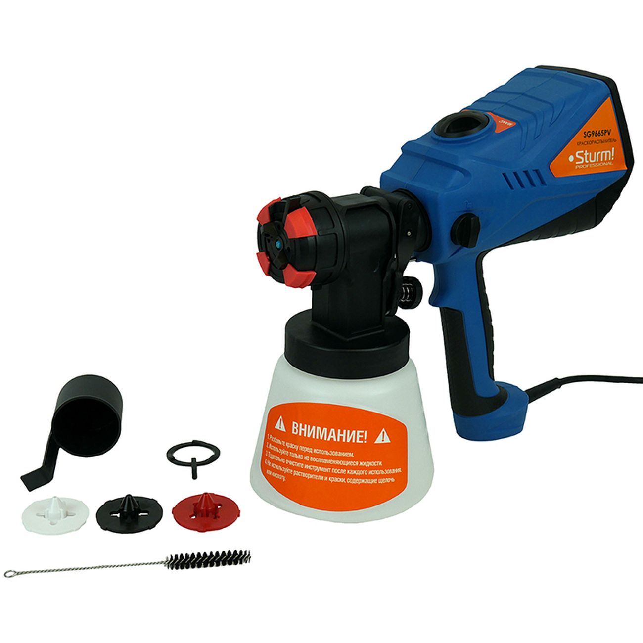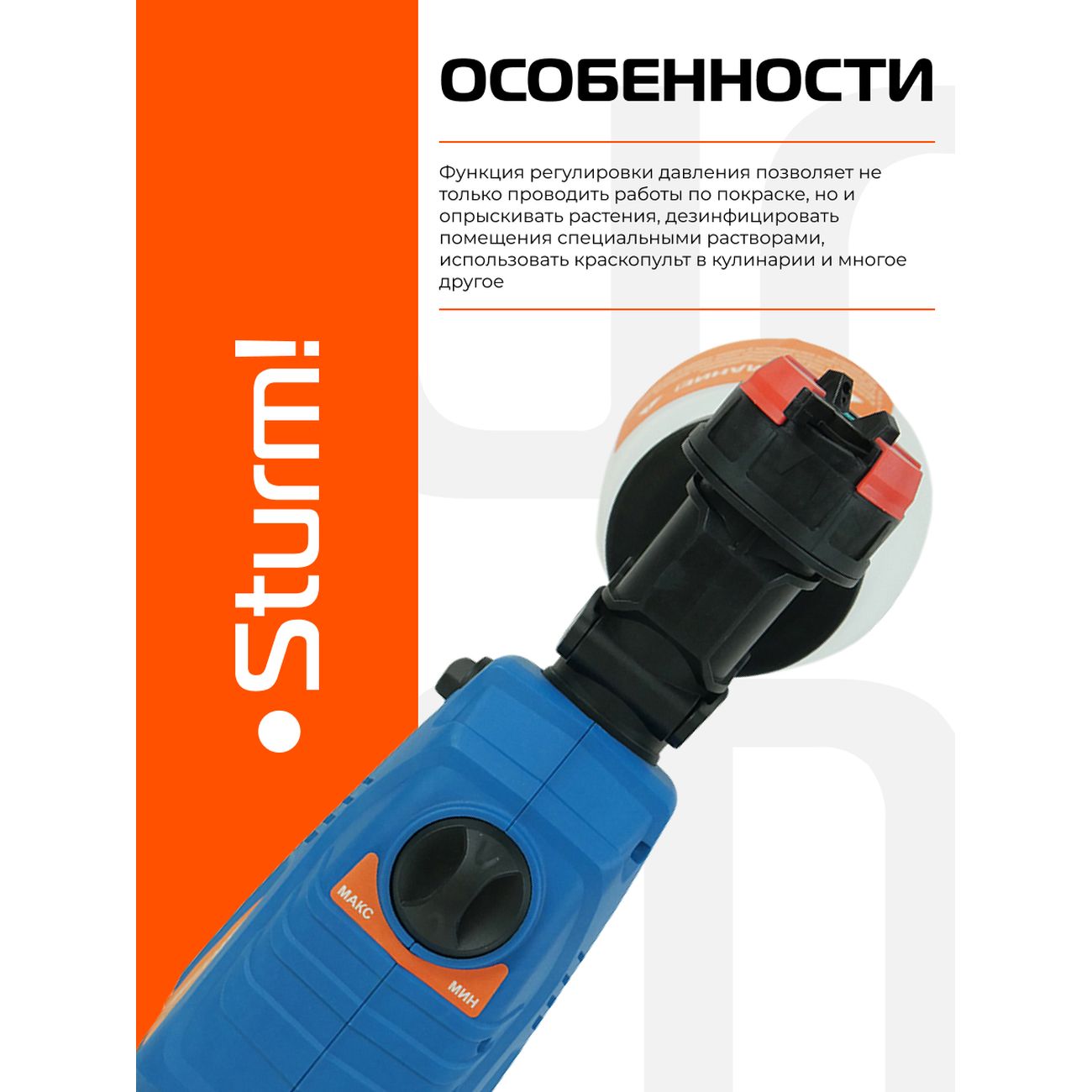 У этого аппарата имеется режим самостоятельной регулировки расхода краски и факела распыления с помощью регулятора на корпусе. Бак располагается снизу, что удобней в работе. Имеются сменные насадки. Слой грунтовки, краски или лака получается идеально ровный. Для меня, как для реставратора мебели, этот прибор стал необходимым помощником. В нем помещается целый литр жидкости и этого хватает на большую площадь окрашивания.
