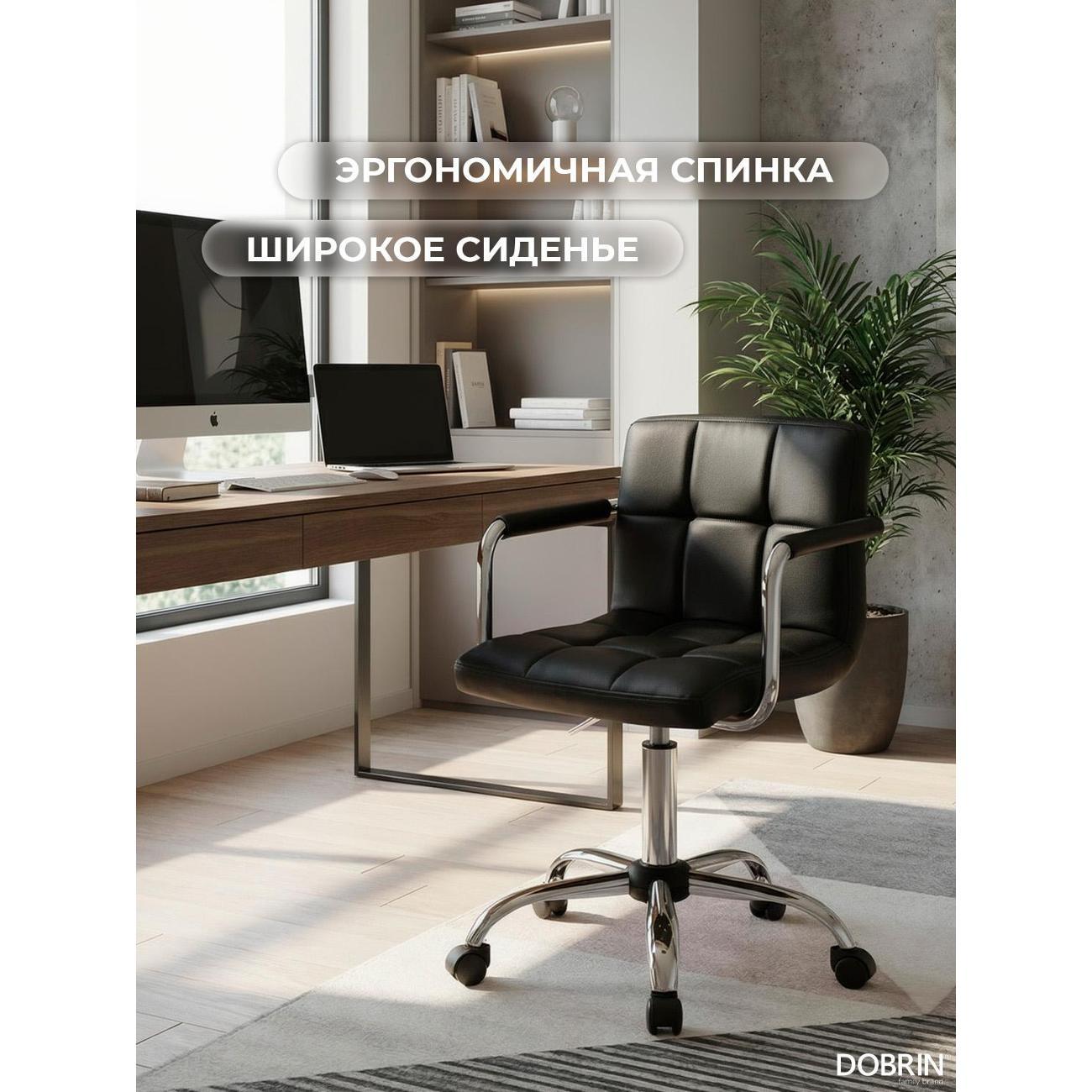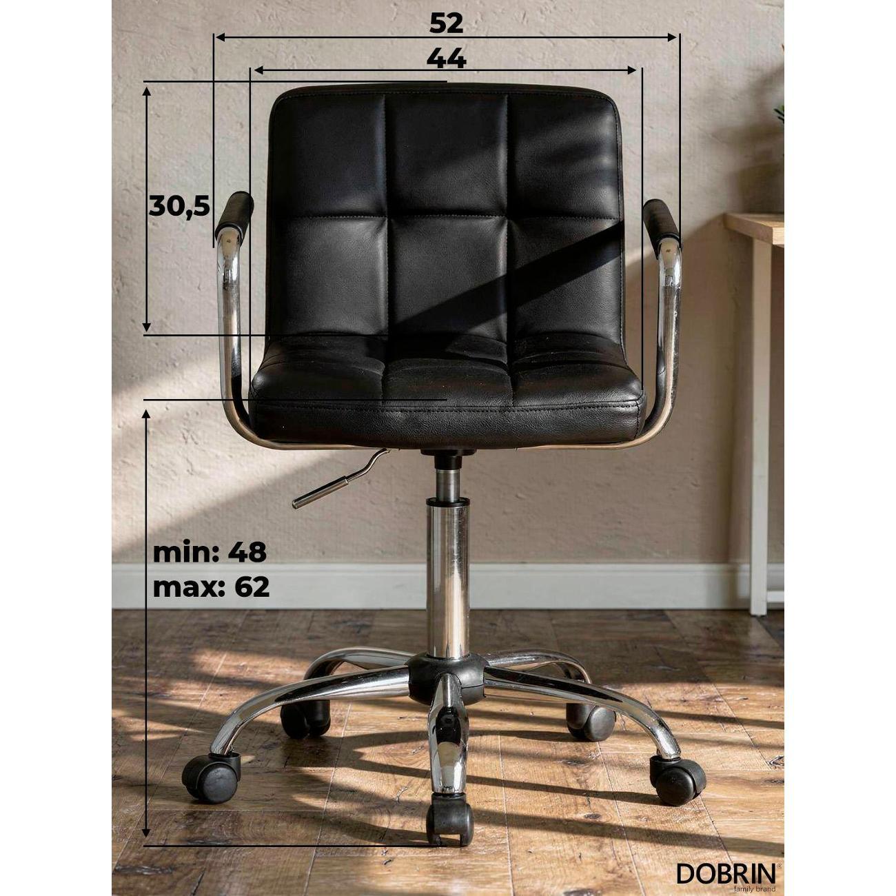 Офисное кресло для персонала DOBRIN TERRY (чёрный). Материал обивки искусственная кожа. Материал каркаса фанера. Материал основания металл. Размеры: высота 95(81) см, ширина 58 см, глубина 58 см, ширина и длина основания 58 см. Размеры сиденья: высота сиденья 62(48) см, ширина сиденья 44 см, глубина сиденья 38 см, толщина сиденья 5 см, высота спинки 30,5 см. Офисные кресла на пятилучье. Форма сиденья квадратная, сиденье мягкое. Подлокотники с высотой 19 см. Офисные кресла с регулировкой высоты. Товар изготовлен по уникальному дизайну и эскизу DOBRIN с любовью к мебели. Максимальная нагрузка на офисные кресла для персонала 100 кг. Гарантийный срок 12 месяцев, минимальный срок службы от 5 лет. Комфорт, прочность и эргономичность данного кресла отлично подойдут для персонала компании, которые постоянно работают в офисе.