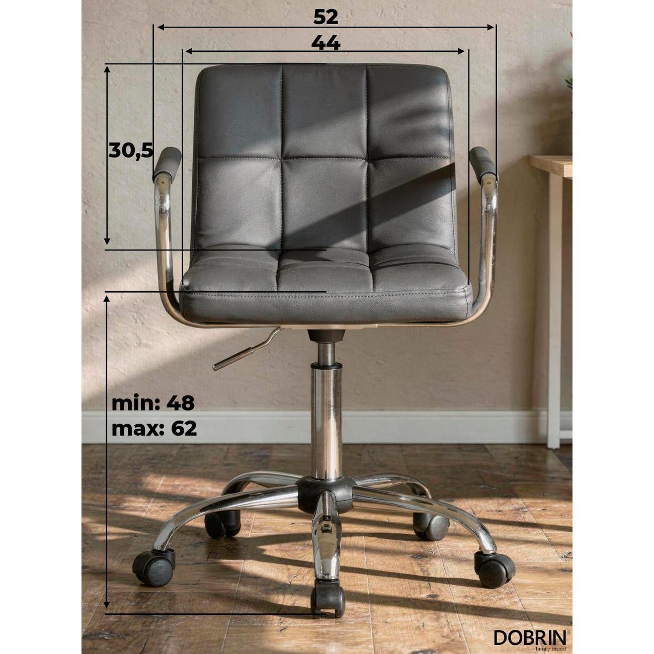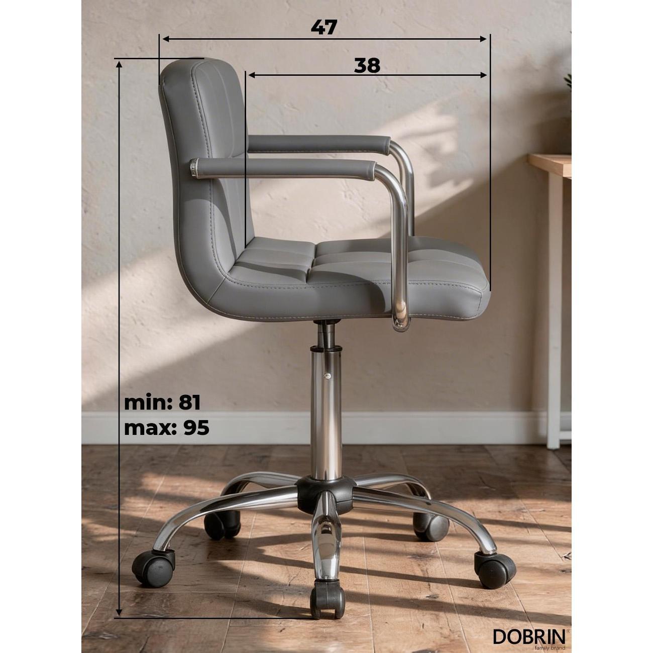 Офисное кресло для персонала DOBRIN TERRY (серый). Материал обивки искусственная кожа. Материал каркаса фанера. Материал основания металл. Размеры: высота 95(81) см, ширина 58 см, глубина 58 см, ширина и длина основания 58 см. Размеры сиденья: высота сиденья 62(48) см, ширина сиденья 44 см, глубина сиденья 38 см, толщина сиденья 5 см, высота спинки 30,5 см. Офисные кресла на пятилучье. Форма сиденья квадратная, сиденье мягкое. Подлокотники с высотой 19 см. Офисные кресла с регулировкой высоты. Товар изготовлен по уникальному дизайну и эскизу DOBRIN с любовью к мебели. Максимальная нагрузка на офисные кресла для персонала 100 кг. Гарантийный срок 12 месяцев, минимальный срок службы от 5 лет. Комфорт, прочность и эргономичность данного кресла отлично подойдут для персонала компании, которые постоянно работают в офисе.