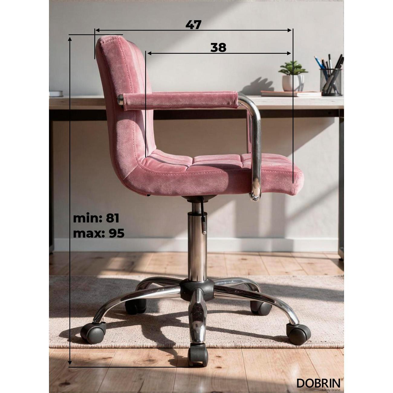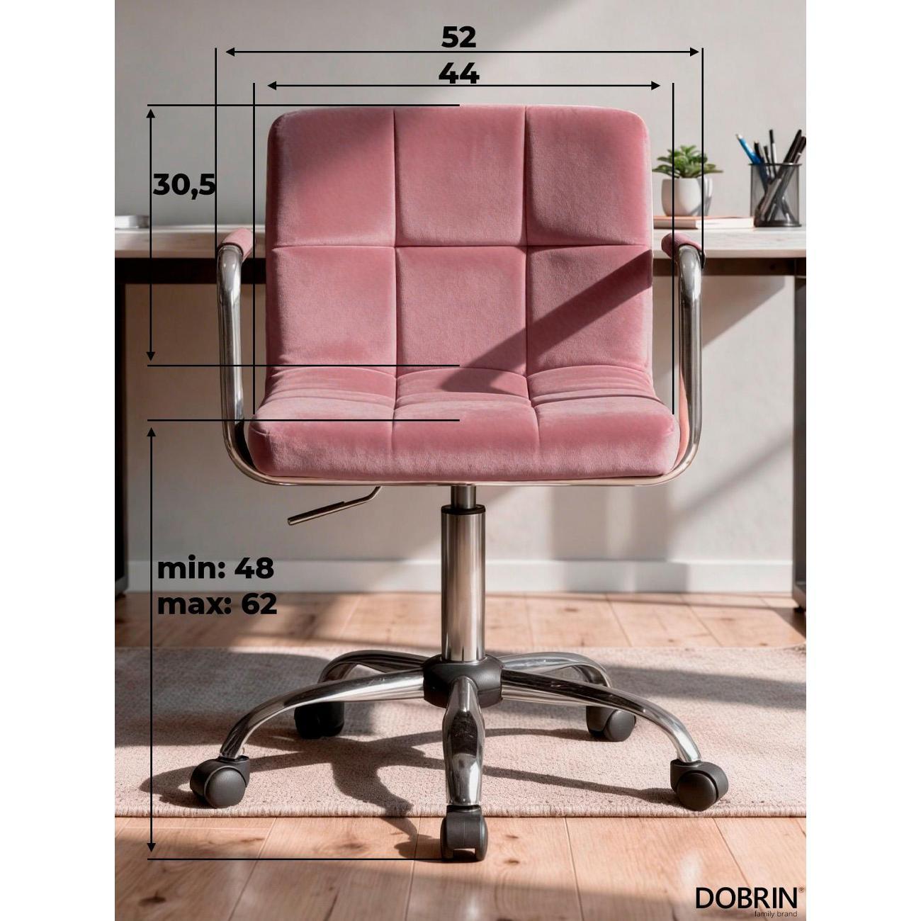 Офисное кресло для персонала DOBRIN TERRY (пудрово-розовый велюр (MJ9-32)). Материал обивки велюр искусственный. Материал каркаса фанера. Материал основания металл. Размеры: высота 95(81) см, ширина 58 см, глубина 58 см, ширина и длина основания 58 см. Размеры сиденья: высота сиденья 62(48) см, ширина сиденья 44 см, глубина сиденья 38 см, толщина сиденья 5 см, высота спинки 30,5 см. Офисные кресла на пятилучье. Форма сиденья квадратная, сиденье мягкое. Подлокотники с высотой 19 см. Офисные кресла с регулировкой высоты. Товар изготовлен по уникальному дизайну и эскизу DOBRIN с любовью к мебели. Максимальная нагрузка на офисные кресла для персонала 100 кг. Гарантийный срок 12 месяцев, минимальный срок службы от 5 лет. Комфорт, прочность и эргономичность данного кресла отлично подойдут для персонала компании, которые постоянно работают в офисе.