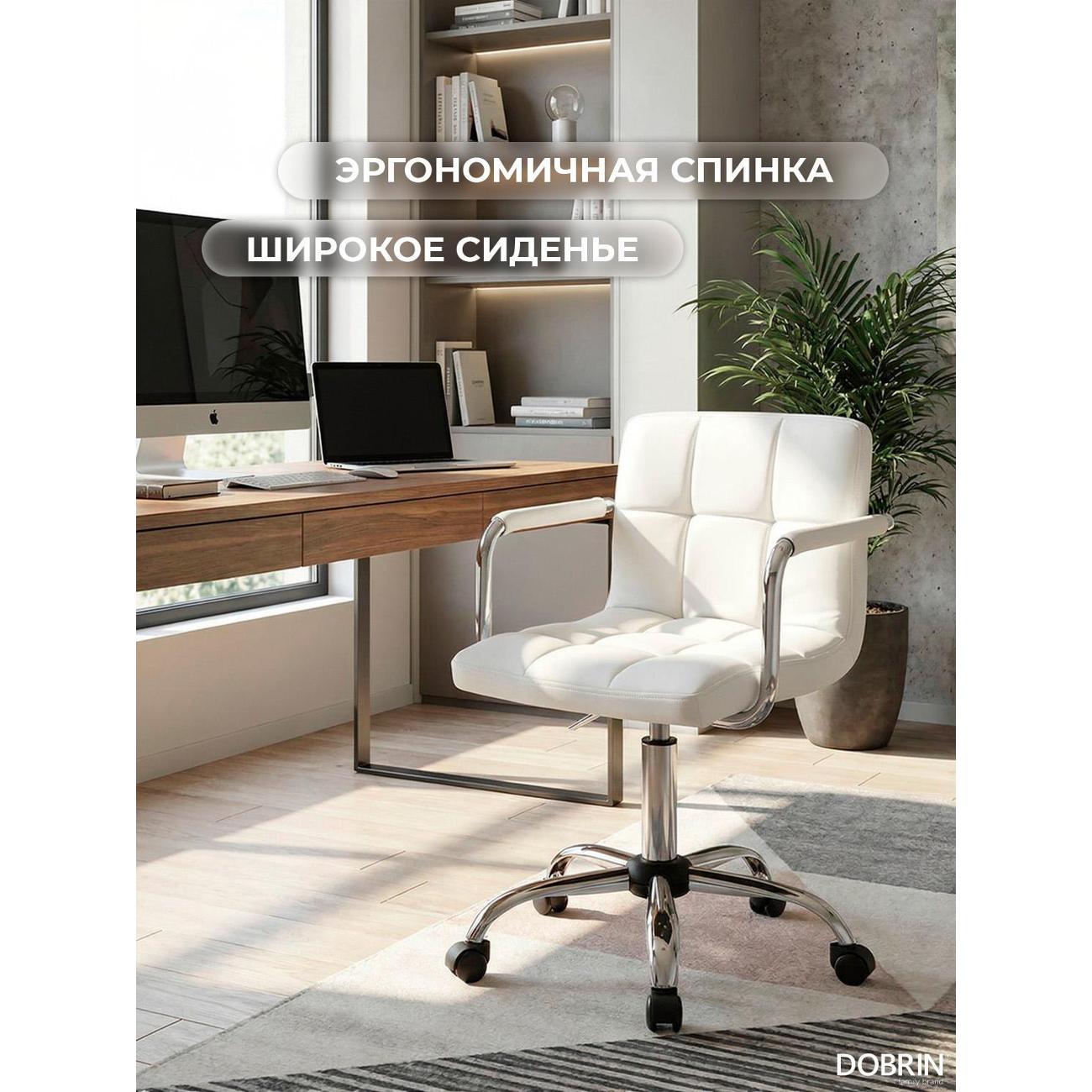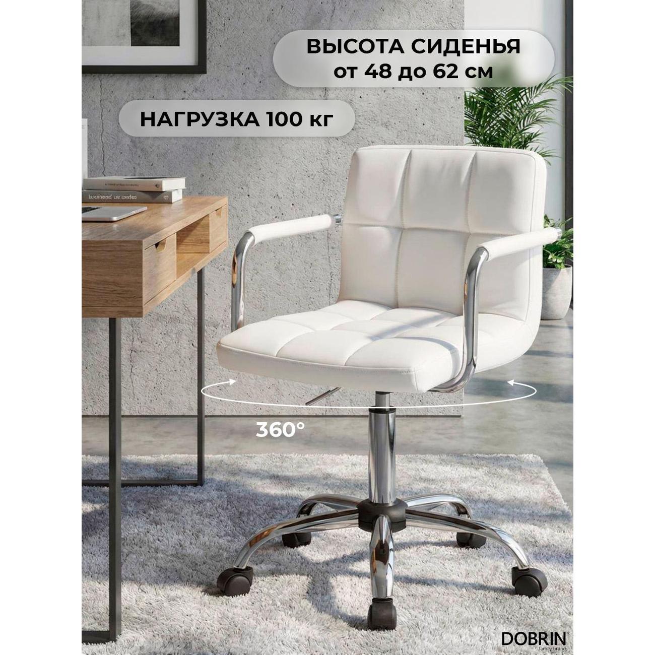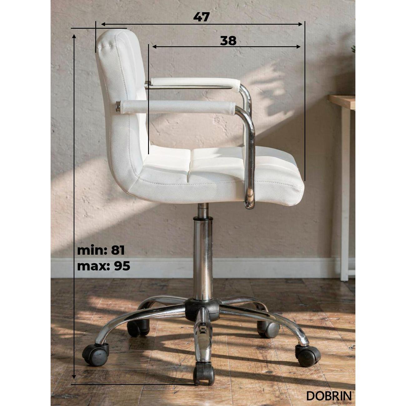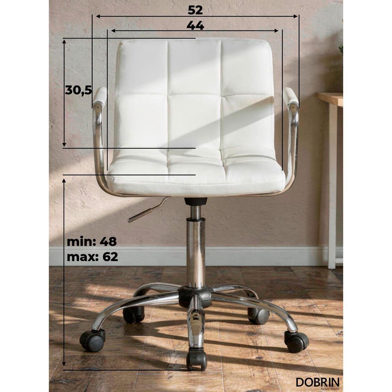 Офисное кресло для персонала DOBRIN TERRY (белый). Материал обивки искусственная кожа. Материал каркаса фанера. Материал основания металл. Размеры: высота 95(81) см, ширина 58 см, глубина 58 см, ширина и длина основания 58 см. Размеры сиденья: высота сиденья 62(48) см, ширина сиденья 44 см, глубина сиденья 38 см, толщина сиденья 5 см, высота спинки 30,5 см. Офисные кресла на пятилучье. Форма сиденья квадратная, сиденье мягкое. Подлокотники с высотой 19 см. Офисные кресла с регулировкой высоты. Товар изготовлен по уникальному дизайну и эскизу DOBRIN с любовью к мебели. Максимальная нагрузка на офисные кресла для персонала 100 кг. Гарантийный срок 12 месяцев, минимальный срок службы от 5 лет. Комфорт, прочность и эргономичность данного кресла отлично подойдут для персонала компании, которые постоянно работают в офисе.