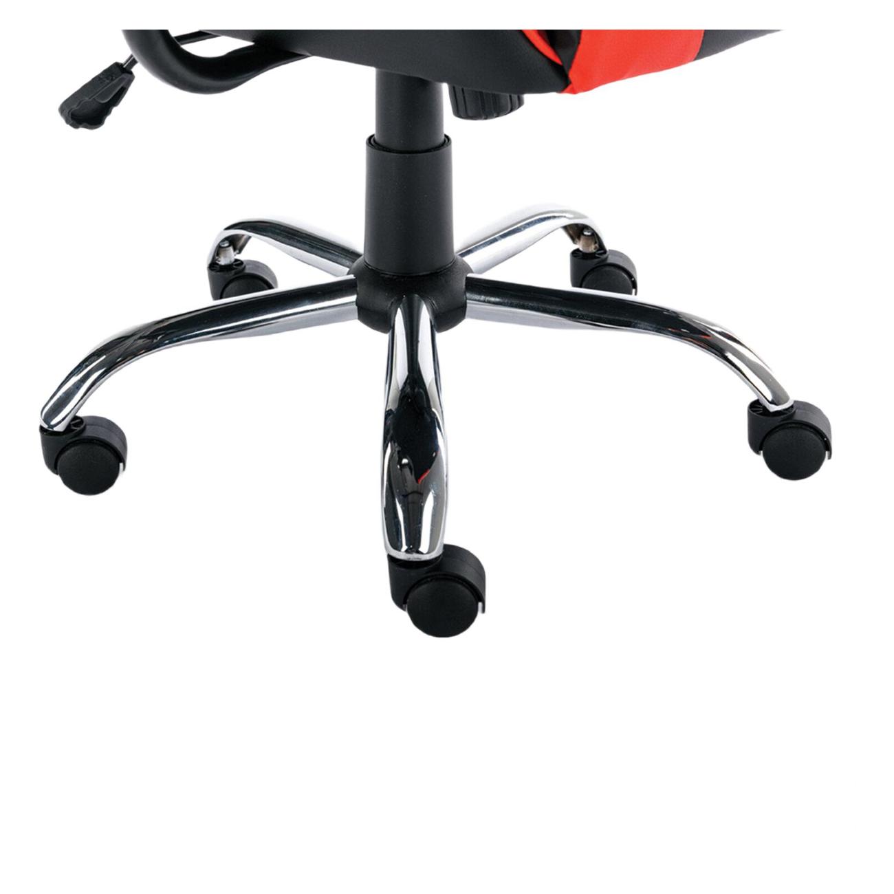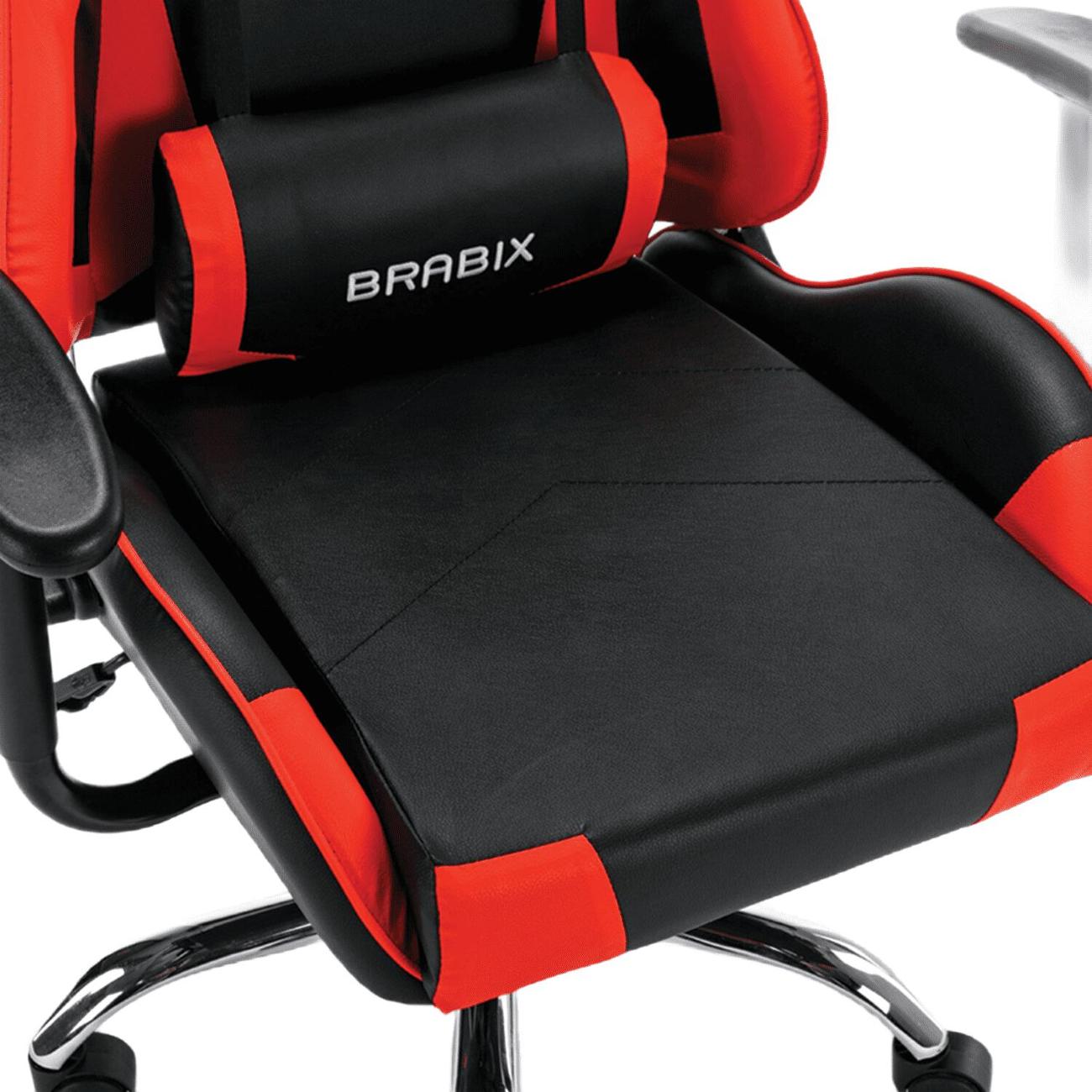Компьютерное игровое кресло Brabix Hunter GM-130 532797 оформлено в черно-красных тонах. За основу взята металлическая крестовина, дополненная колесиками для легкого перемещения по комнате. Обивка выполнена из экокожи, материалом для подлокотников выбран ударопрочный пластик. Модель справляется с нагрузкой до 140 кг, оснащается газовым лифтом и поддержкой регулировки высоты сиденья в диапазоне от 46,5 см до 49 см. Предусмотрен механизм качания и вращения. Вес конструкции составил 17,29 кг при габаритах 129х72х46,5 см.
