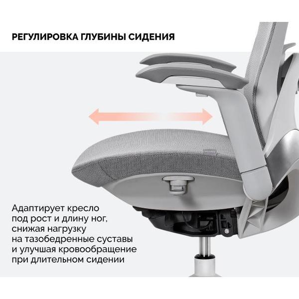 Регулировка глубины сидения обеспечивает точную подстройку под рост пользователя до 180 см. Для максимального комфорта предусмотрены откидные 3D-подлокотники, которые можно отрегулировать под свои предпочтения или убрать, если они мешают. Поддержку шеи обеспечивает 2D-подголовник с гибкой настройкой.