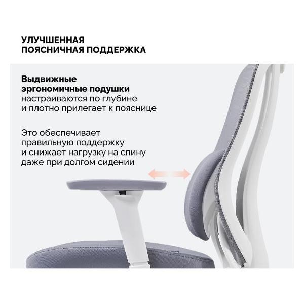 Особенность модели – в усовершенствованной поясничной поддержке. Специальные подушки настраиваются по глубине, за счёт этого спинка плотно прилегает к пояснице, обеспечивая правильную поддержку и снижая нагрузку на спину даже при долгом сидении.