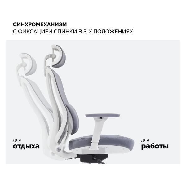 В кресло встроен синхромеханизм с фиксацией спинки в трёх положениях. Вы можете переключать режимы и использовать кресло для сосредоточенной работы за столом, короткого отдыха с лёгким отклонением и полноценного перерыва с «лежачим» положением.