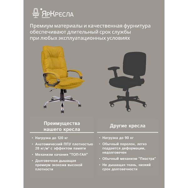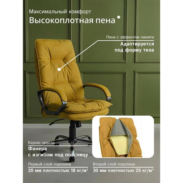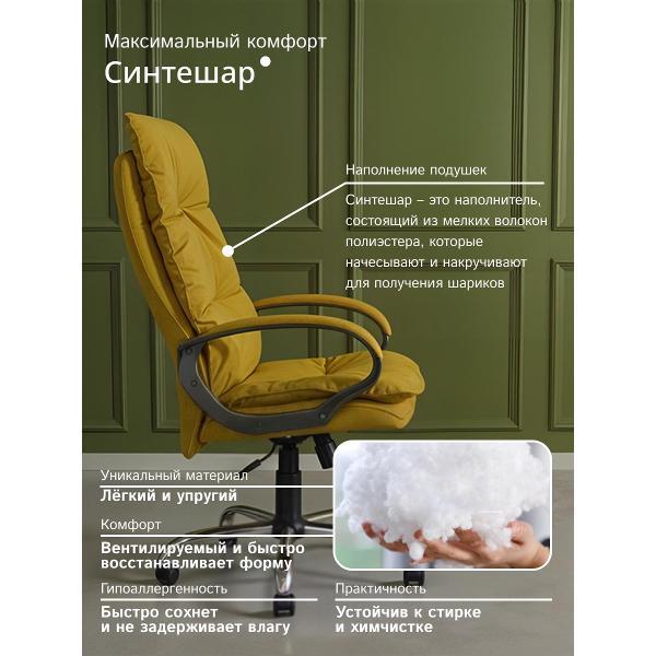 Мягкое компьютерное кресло - это стильное и удобное решение для дома, офиса или кабинета руководителя. Эргономичная конструкция офисного кресла соответствует анатомической форме человека, что помогает снизить нагрузку и усталость при работе за компьютером. Механизм качания интерьерного кресла топ-ган позволяет регулировать кресло по высоте, фиксировать спинку в вертикальном положении и регулировать жесткости качания. Сиденье и спинка кресла в комнату, выполнены из ткани SORO шенилл повышенной прочности, что гарантирует долговечность офисного кресла. Обивка мягкая на ощупь и неприхотлива в уходе. Кресло мягкое в гостиную установлено на каркас из фанеры. Анатомические пластиковые подлокотники черного цвета c мягкой накладкой в цвет кресла. Крестовина диаметром 700мм из хромированной стали, ролики имеют мягкий ход, и не портят напольное покрытие.