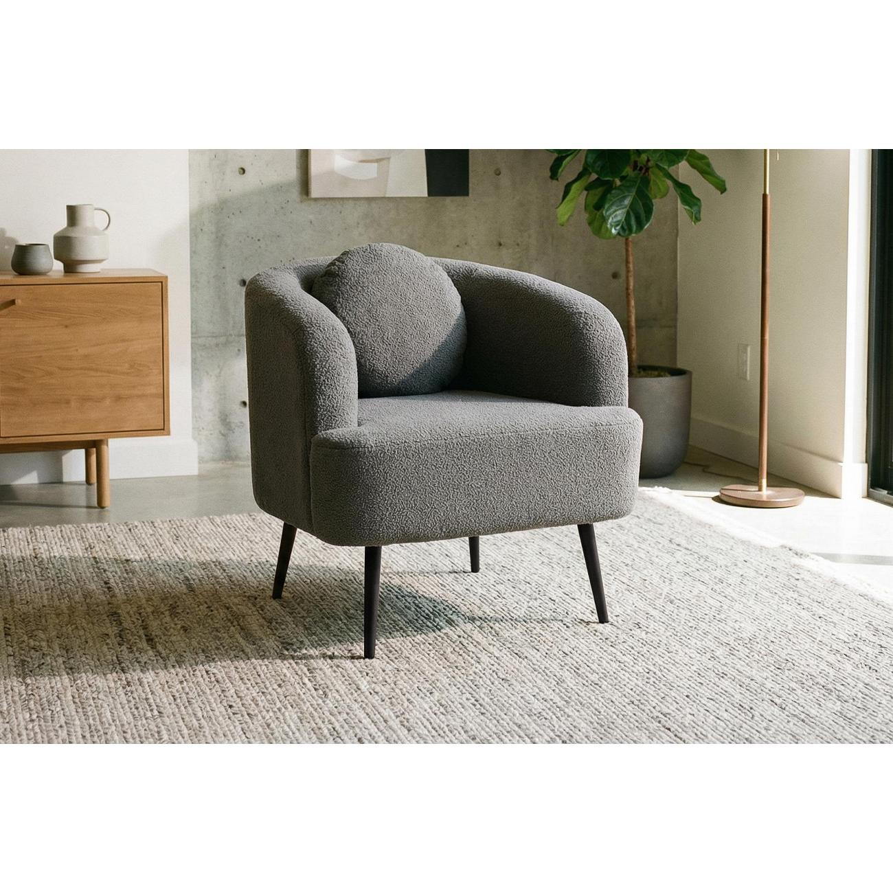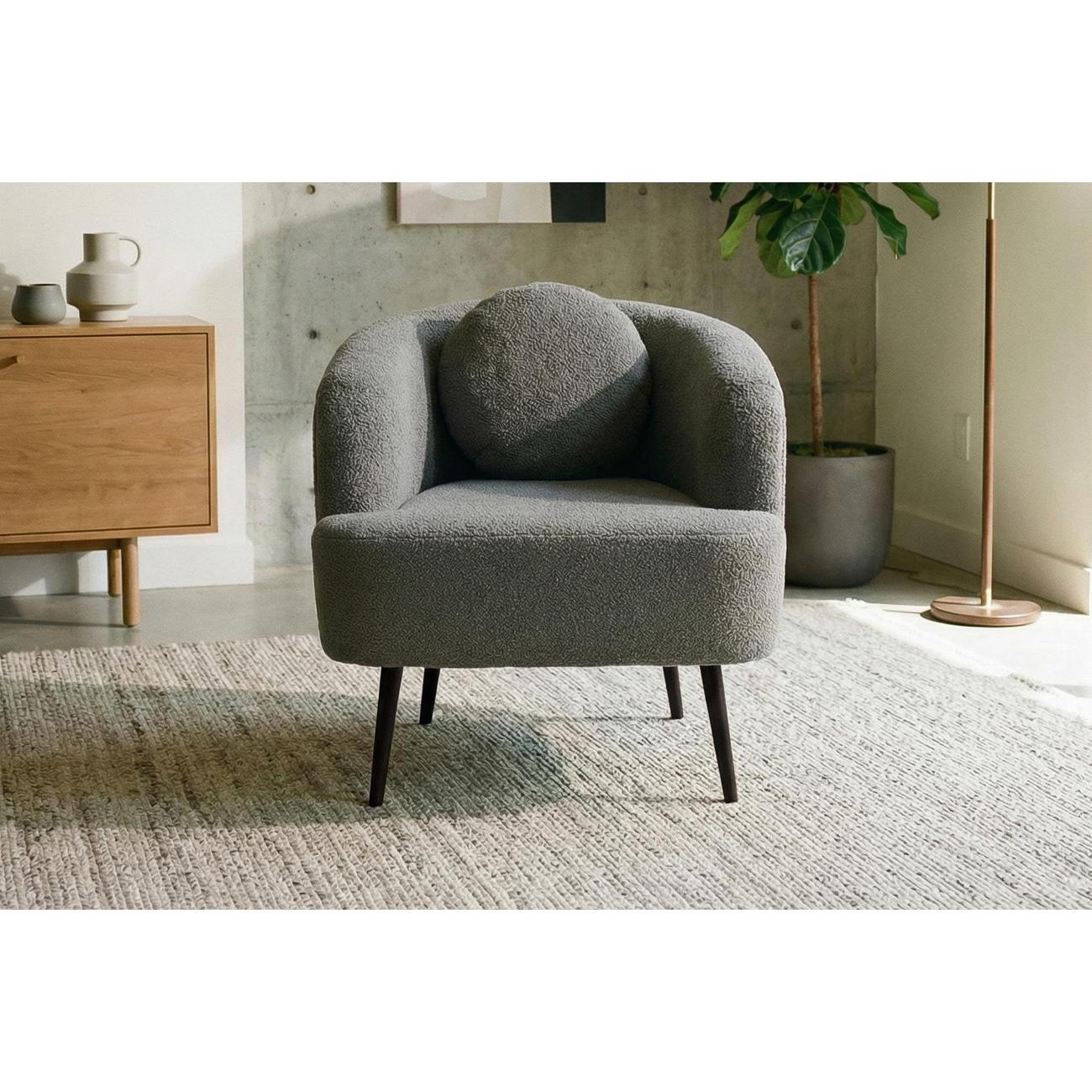 Удобный дизайнерский предмет мебели идеально впишется в современный интерьер дома, гостиной, спальни, кабинета, детской, кухни или балкона. Мягкая текстура обивки визуально и тактильно создает уют, а компактная конструкция позволяет разместить изделие даже в небольшой комнате. Каркас выполнен из дерева, что придает прочность и долговечность, а высокие ножки из металла добавляют легкости и гармонично сочетаются с общим стилем лофт или классическим оформлением пространства. Округлая форма спинки и подлокотники обеспечивают дополнительный комфорт для отдыха после рабочего дня, а декоративная подушка поддерживает поясницу. Мягкое сиденье способствует полноценному расслаблению, создавая атмосферу уюта в любой домашней обстановке. Благодаря универсальному дизайну и нейтральному оттенку, изделие легко комбинируется с другой мебелью, например, диванами или журнальными столиками, и подходит для офисных пространств.