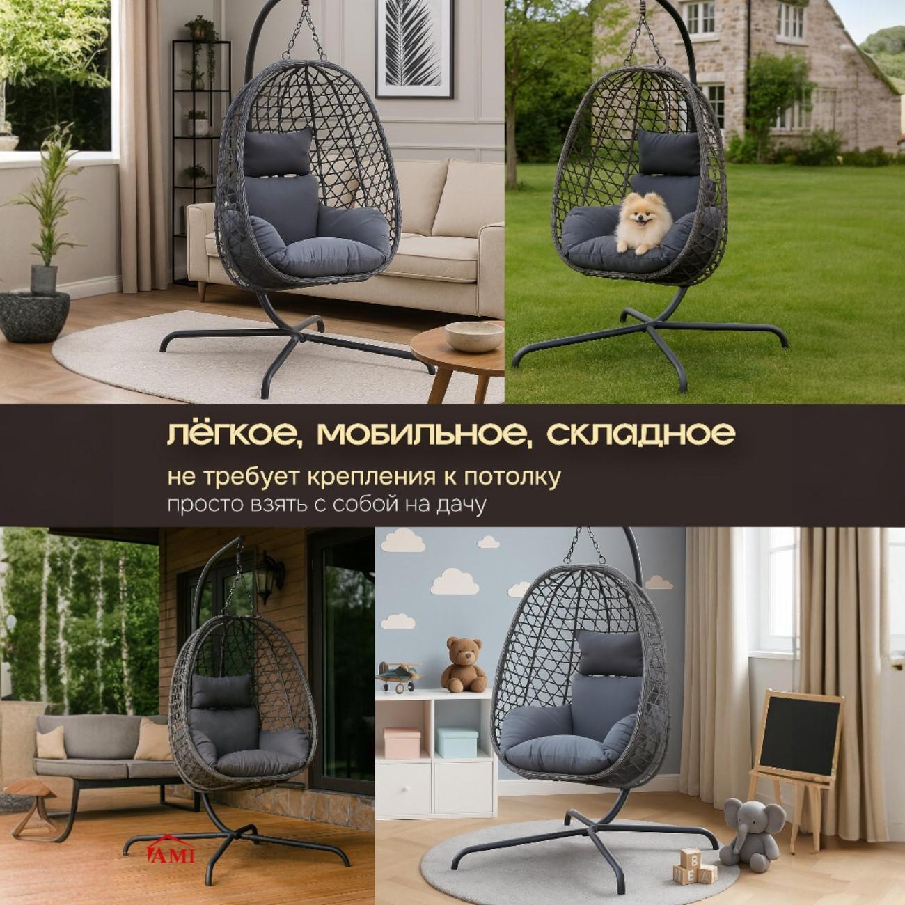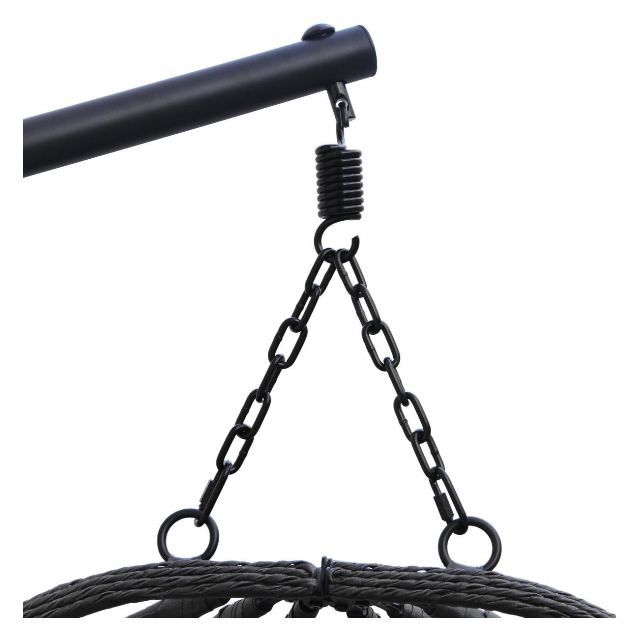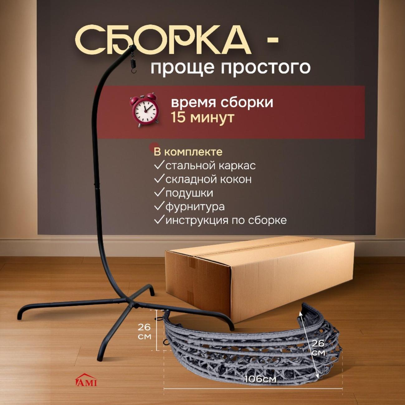 Прочная рама из стальной трубы с порошковым покрытием гарантирует устойчивость и долговечность, а напольная конструкция подвесных качелей избавляет от необходимости сложного монтажа. Плавное покачивание складного кокона помогает снять напряжение и создает атмосферу полной релаксации. Стильное уличное кресло легко вписывается в современный или лофт стиль, становясь изюминкой любого дома.