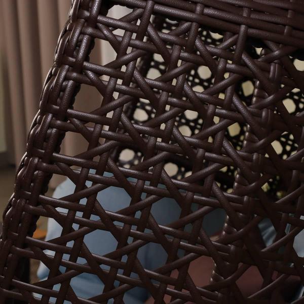 Каркас кокона выполнен из алюминия, имеет цельносварное исполнение и покрыт защитным лакокрасочным слоем. Плетение выполнено из искусственного ротанга типа «лента» толщиной 8 мм с фактурой «венге с тиснением под кожу». Материал устойчив к влаге, ультрафиолету и перепадам температур, не подвержен растрескиванию, рассыханию и выцветанию. Плотное переплетение обеспечивает прочность и стабильность посадочного места.