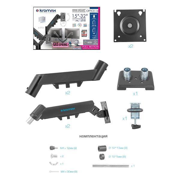 Вы можете купить Кронштейн для монитора Kromax OFFICE-14 в магазинах М.Видео по доступной цене. Кронштейн для монитора Kromax OFFICE-14: подробное описание, фото и отзывы реальных покупателей, характеристики, возможность скачать инструкции и подобрать аксессуары.